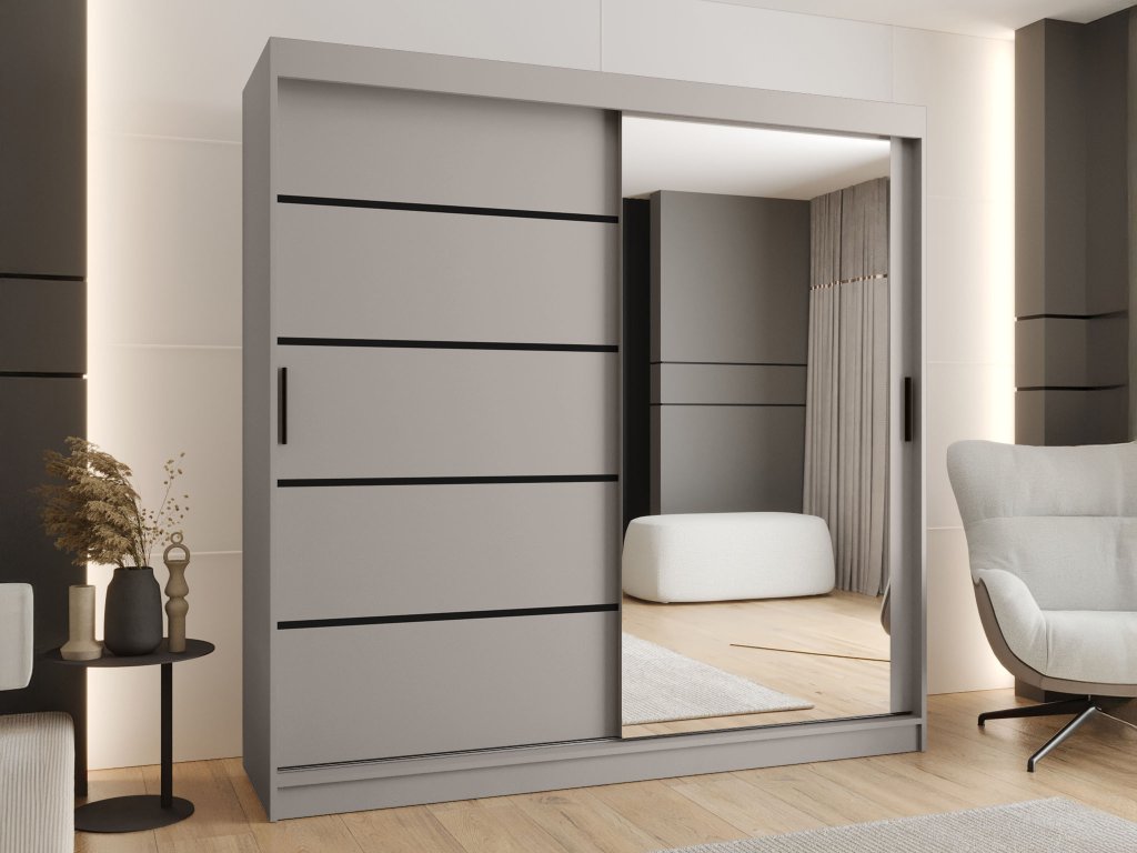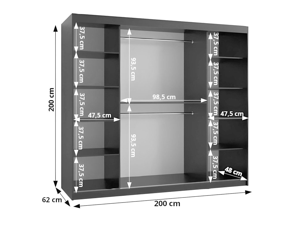 Skriňa je vybavená spoľahlivým posuvným systémom LAGUNA, ktorý umožňuje tichý a plynulý pohyb dverí. Vo vnútri nájdete dve kovové tyče na zavesenie oblečenia a osem políc, ideálne na zložené veci, posteľnú bielizeň alebo doplnky. Hrany sú chránené PVC dyhou s hrúbkou 0,5 mm, ktorá zvyšuje odolnosť a chráni skriňu pred poškodením. Stabilitu dopĺňajú hliníkové výsuvy a pevná zadná doska z HDF materiálu, vďaka čomu je konštrukcia robustná a spoľahlivá.