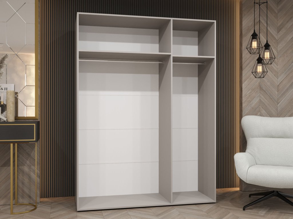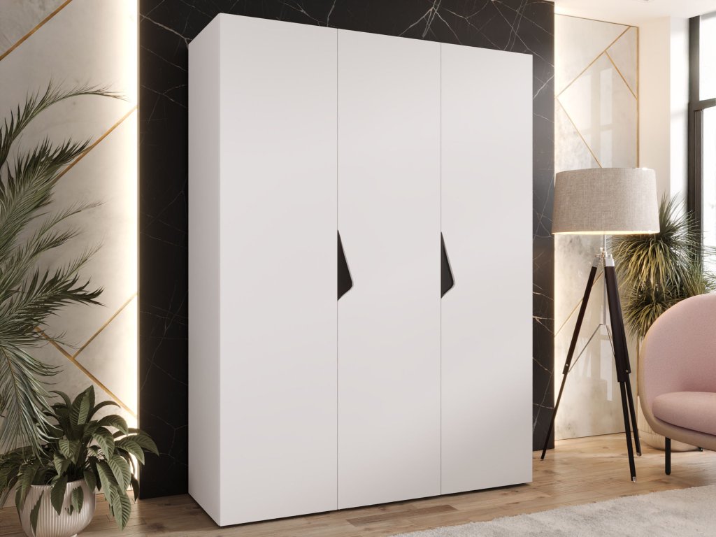 Biela šatníková skriňa Sandi 1 v šírke 150 cm je ideálnou voľbou pre každého, kto hľadá rovnováhu medzi veľkorysým úložným priestorom a vizuálnou ľahkosťou. Biela farba opticky rozširuje miestnosť a v kombinácii s čiernym kontrastným výrezom na čelách vytvára moderný, až grafický efekt. Tento model už nie je len doplnkom, ale dominantným prvkom spálne či šatníka, ktorý vďaka frézovaným detailom a elegantným kovovým úchytkám pôsobí mimoriadne sofistikovane. Je to riešenie, ktoré vnesie poriadok do vášho šatstva bez toho, aby interiér pôsobil stiesnene.