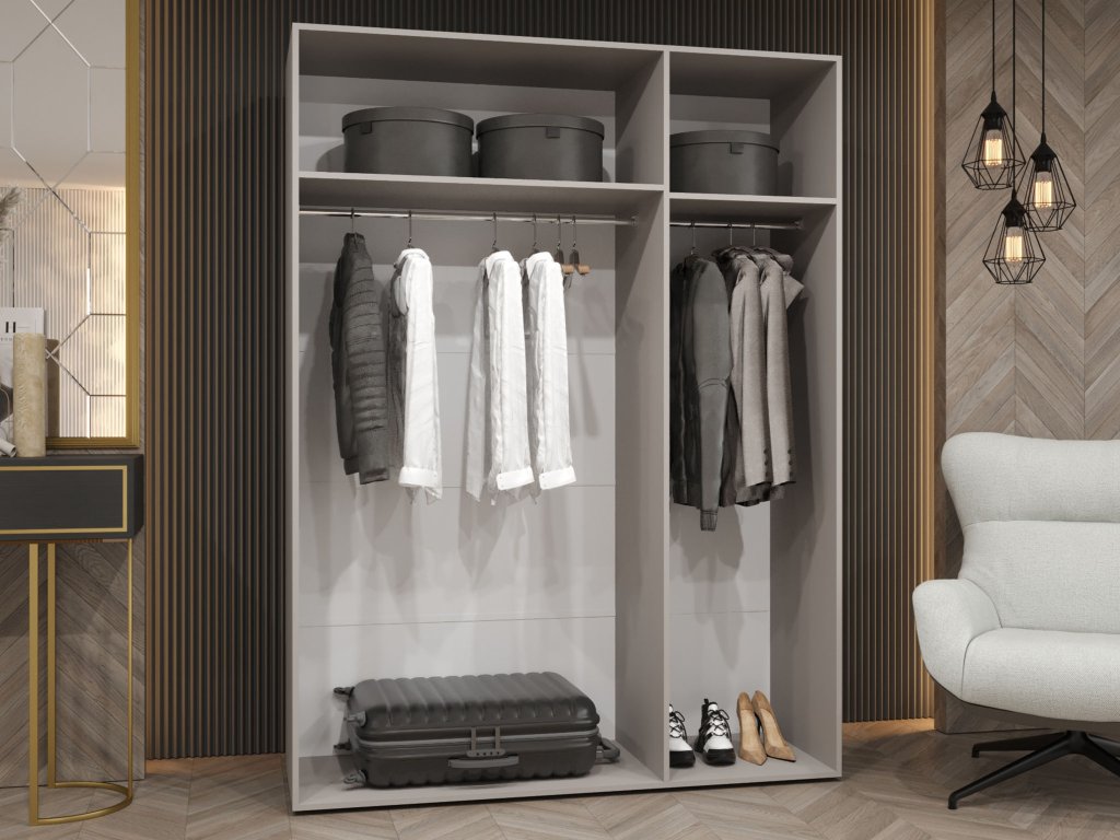 Šatníkovú skriňu môžete doplniť pohodlnou posteľou, mäkkým koberecom alebo zatemňovacími závesmi, ktoré priestor zútulnia a oživia.