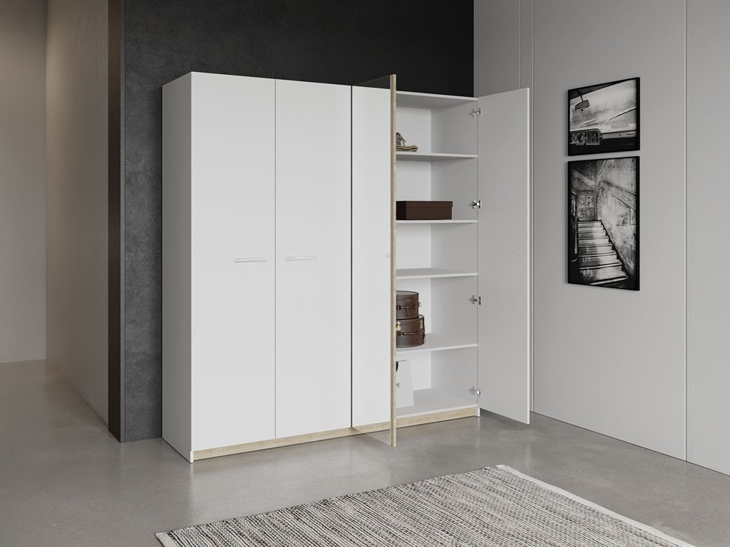 Šatníková skriňa Watson 4 v matnej bielej farbe zaujme čistým, nadčasovým dizajnom a praktickým riešením úložného priestoru. Širšie štvordverové prevedenie ponúka ešte viac miesta pre váš šatník. Vnútro skrine zahŕňa päť priestranných políc a vešiakovú tyč, ideálnu na zavesenie košieľ, šiat či kabátov.