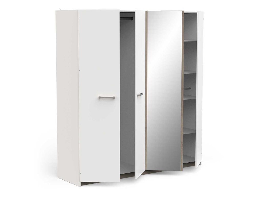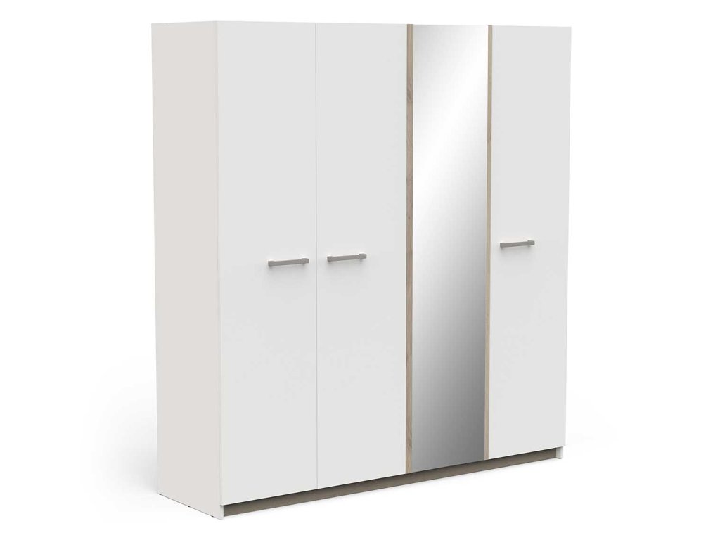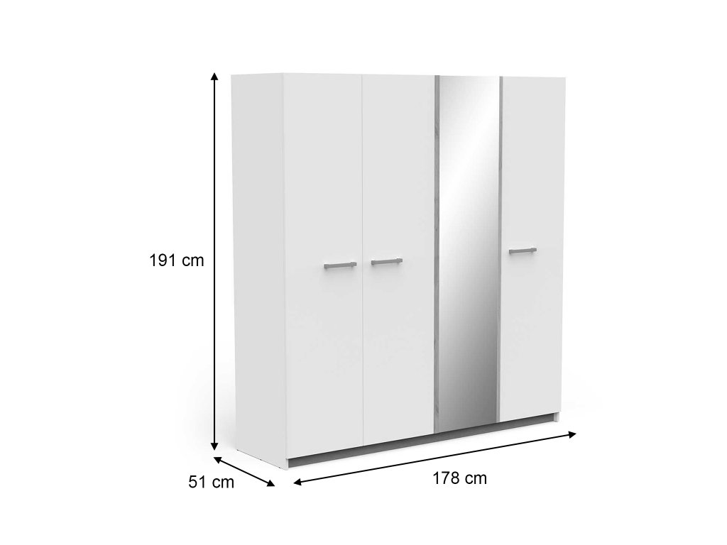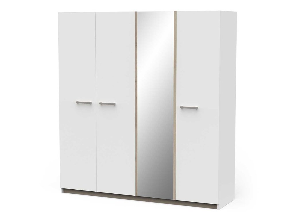 Moderný vzhľad v bielom prevedení vnáša do interiéru svetlosť a pocit priestoru, zatiaľ čo zrkadlo na stredných dverách poslúži ako praktický aj estetický prvok. Skriňa Watson 4 je ideálnou voľbou pre tých, ktorí hľadajú kombináciu štýlu, funkčnosti a prehľadného usporiadania.