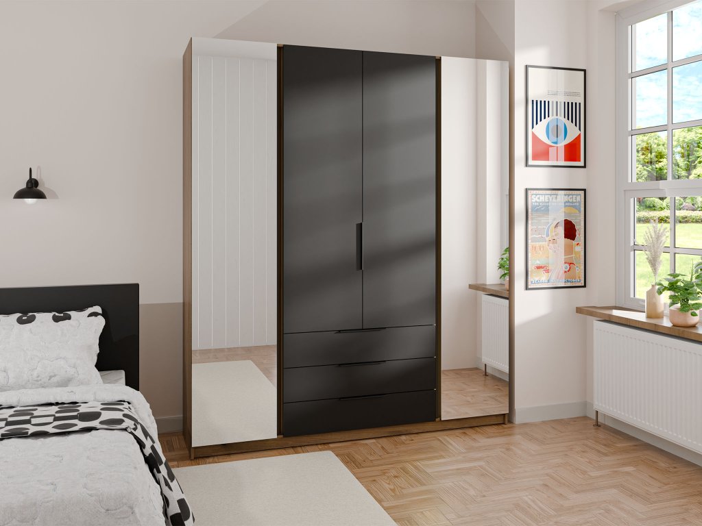 Drevená skriňa Kaja je štvordverová skriňa s nadmerným úložným priestorom na vaše oblečenie, osobné veci alebo dokonca aj posteľnú bielizeň. Môžete ju umiestniť napríklad do spálne, predsiene alebo miestnosti, v ktorej chcete udržiavať poriadok. Táto šatníková skriňa dosahuje šírku 200 cm. Vyrobená je z drevených materiálov. Široká skriňa má štvoro dverí, z toho dvere na vonakajších stranách obsahuje leštené zrkadlo. Dvere s tichým zatváraním zatvoríte pomocou kovových úchytiek v čiernej farbe. Vnútro skrine je rozdelené na tri zásuvky, množstvo poličiek a tyč vhodnú na zavesenie oblečenia.