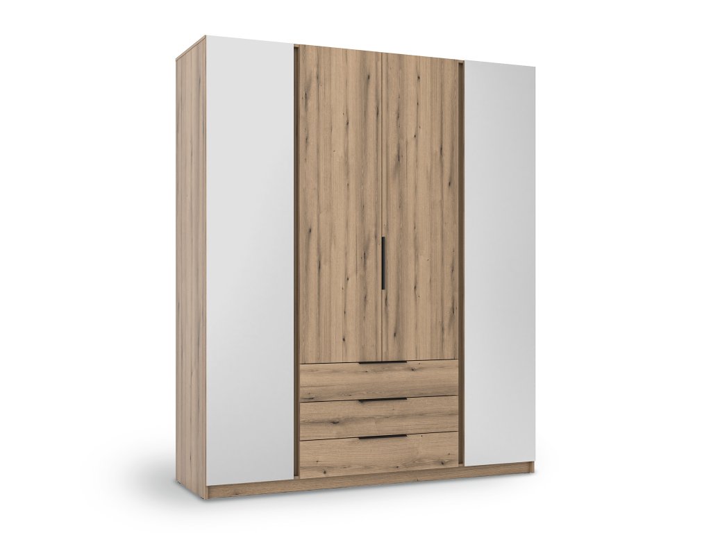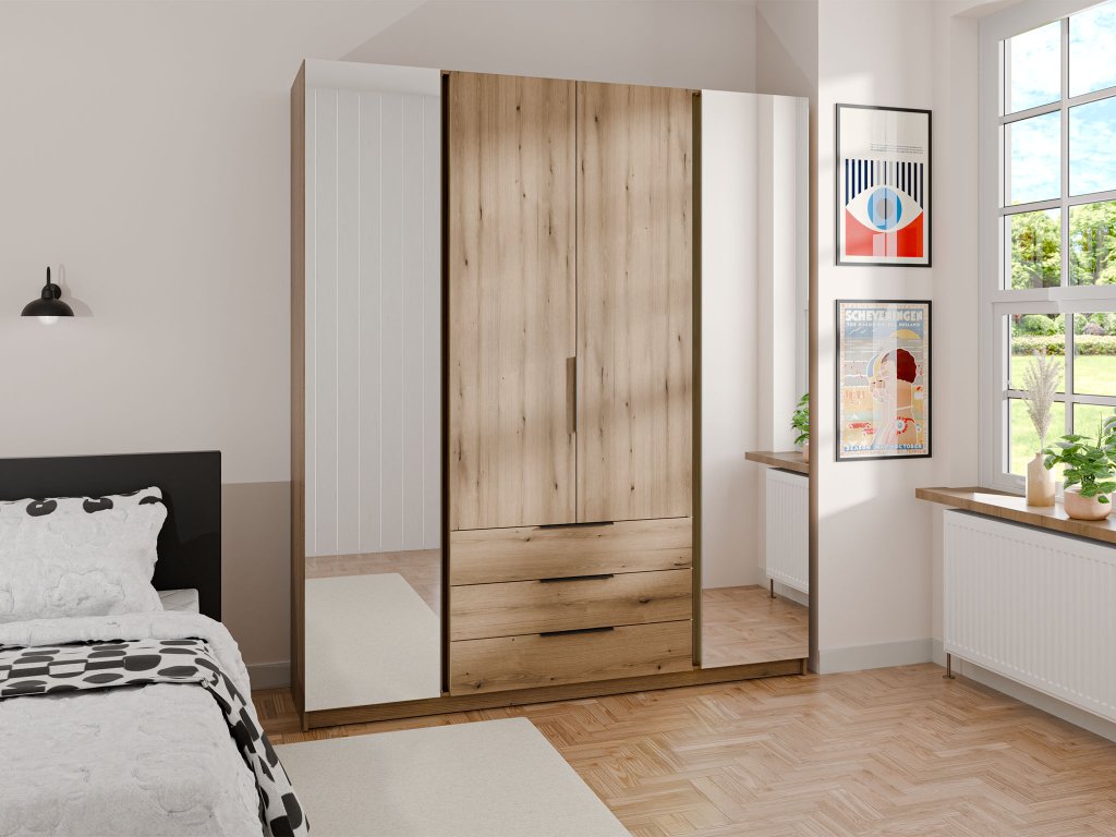 Šatníková skriňa Kaja ponúka praktické riešenie pre tých, ktorí potrebujú dostatočný úložný priestor na svoje oblečenie, napríklad aj na posteľnú bielizeň alebo rôzne bytové doplnky. Dosahuje šírku 200 cm, čím ju dokážete umiestniť do miestnosti u vás domácnosti, ako je spálňa alebo predsieň. Skriňa je vyhotovená z kvalitných drevených materiálov. Disponuje štyrmi dverami, pričom na vonkajších stranách sú umiestnené elegantné zrkadlá. Na dverách s tichým zatváraním sú taktiež namontované čierne kovové úchytky. Vnútro skrine je rozdelené do troch priestranných zásuviek, viacerých poličiek a tyč na zavesenie oblečenia.