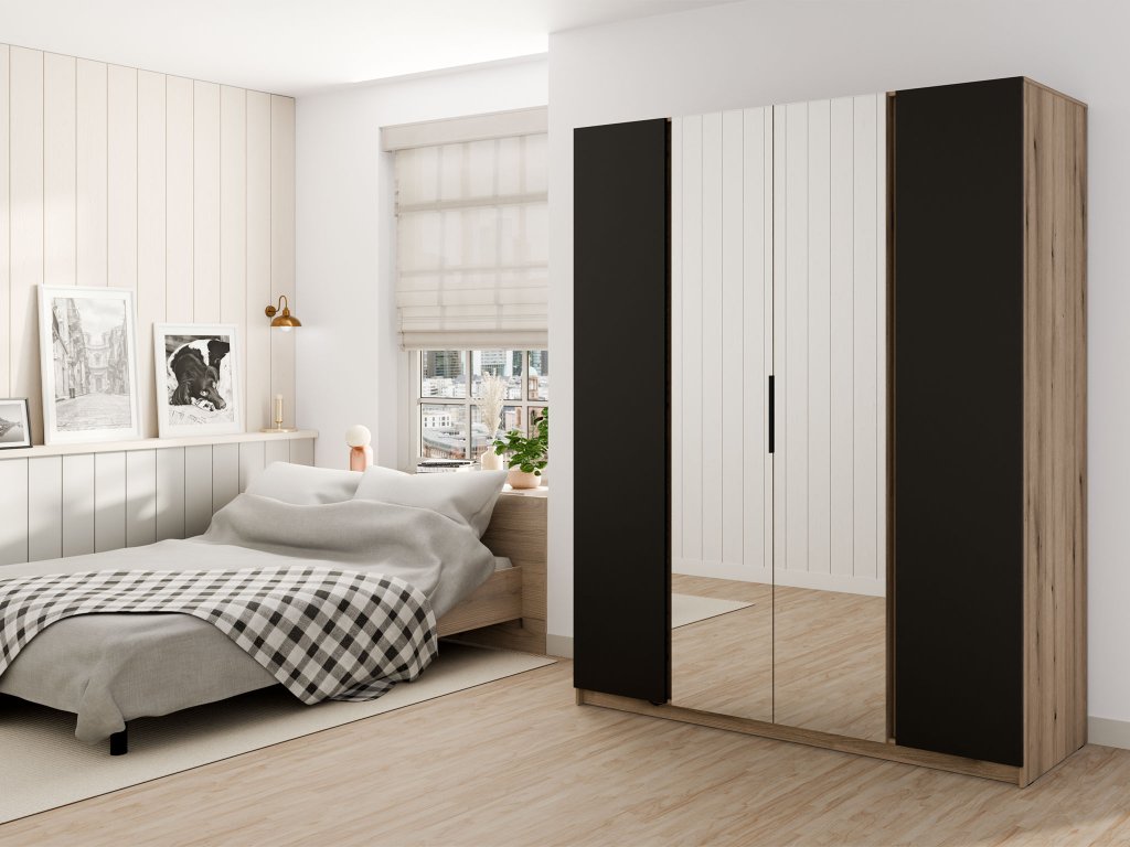 Ak hľadáte praktické a štýlové riešenie na odkladanie vášho oblečenia a domácich doplnkov, štvordverová skriňa Kaja je tou ideálnou voľbou. So šírkou 200 cm poskytuje dostatok úložného priestoru. Jej kombinácia dubového dekoru a čiernej farby ľahko zapadne do akéhokoľvek interiéru. Nezáleží, či ju umiestnite do spálne, predsiene alebo inej miestnosti vo vašom dome. Skriňa je vyrobená z kvalitných materiálov. Jej dvere sú vybavené čiernymi kovovými rukoväťami. Na vnútornej strane dverí nájdete praktické zrkadlo. Vnútorný priestor skrine ponúka tyč na zavesenie odevov a viacero poličiek.