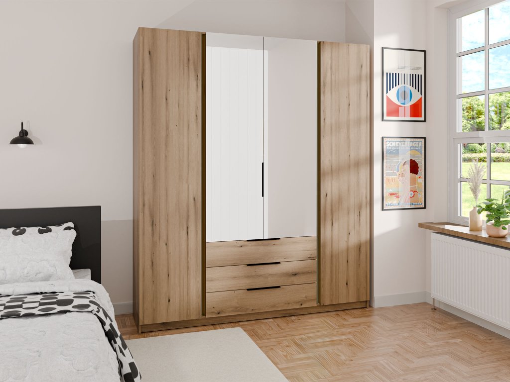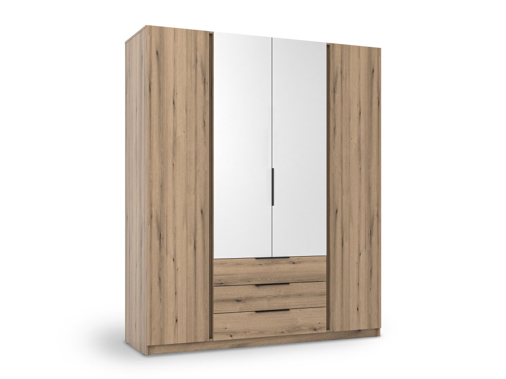 Potrebujete skriňu s dostatočným úložným priestorom? Práve táto skriňa Kaja je ideálnou voľbou, ak preferujete zorganizovaný poriadok. Môžete ju umiestniť napríklad do spálne alebo predsiene, je to len ná vas. Vďaka jej šírke 200 cm, ponúka miesto na uskladnenie oblečenia, sezónych vecí alebo bytových doplnkov. Šatníková skriňa je vyrobená z kvalitného dreva. Má štvoro dverí, z ktorých na vnútorných dvierakach sa nachádzajú leštené zrkadlá. Dvere sú vybavené tichým zatváraním a odolnými kovovýmu úchytmi v čiernej farbe. Vo vnútri skrine nájdete praktické poličky, tyč na zavesenie oblečenia a tri zásuvky.