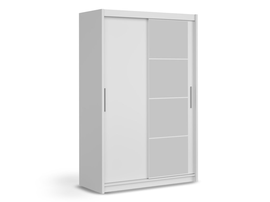 Predná strana skrine kombinuje dvoje dvierka – jedny sú doplnené zrkadlom rozdeleným do štyroch častí, ktoré opticky zväčšuje miestnosť a presvetľuje ju, druhé sú v čistom bielom dekore. Strieborné plastové úchytky dopĺňajú moderný a elegantný vzhľad. Korpus aj predné plochy sú vyrobené z odolnej laminovanej drevotrieskovej dosky, ktorá zaručuje dlhú životnosť a jednoduchú údržbu.