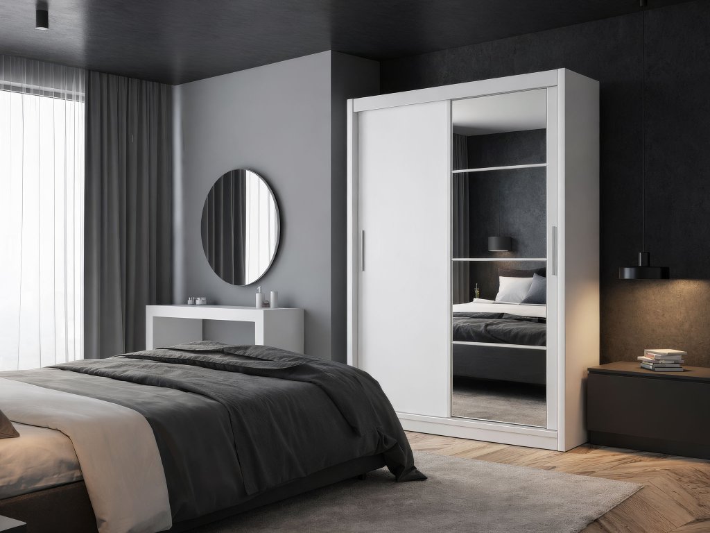 Pre dokonale zladenú spálňu odporúčame doplniť skriňu o bielu komodu, manželskú posteľ či nočné stolíky.