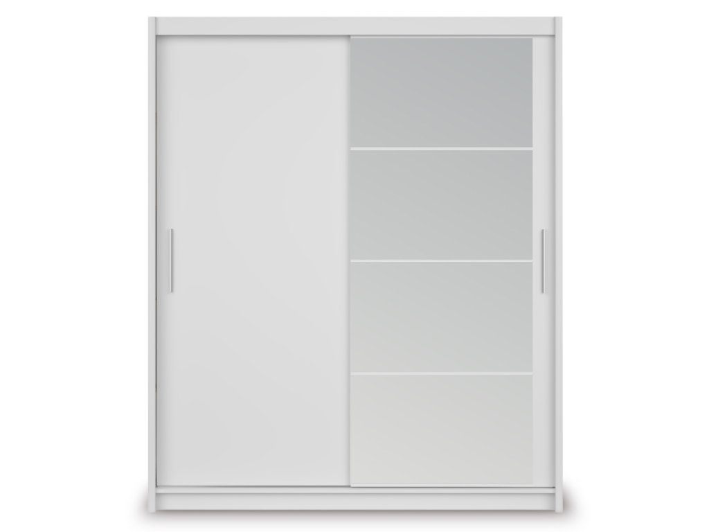 Predná časť skrine kombinuje dvoje dvierka – jedny sú doplnené zrkadlom rozdeleným do štyroch častí, ktoré opticky zväčšuje miestnosť a presvetľuje ju, druhé sú v čistom bielom dekore. Strieborné plastové úchytky elegantne dopĺňajú moderný vzhľad skrine. Je vyrobená z pevnej laminovanej drevotrieskovej dosky, skriňa Marios je odolná, ľahko udržiavateľná a vydrží dlhé roky bez straty funkčnosti alebo estetického vzhľadu.