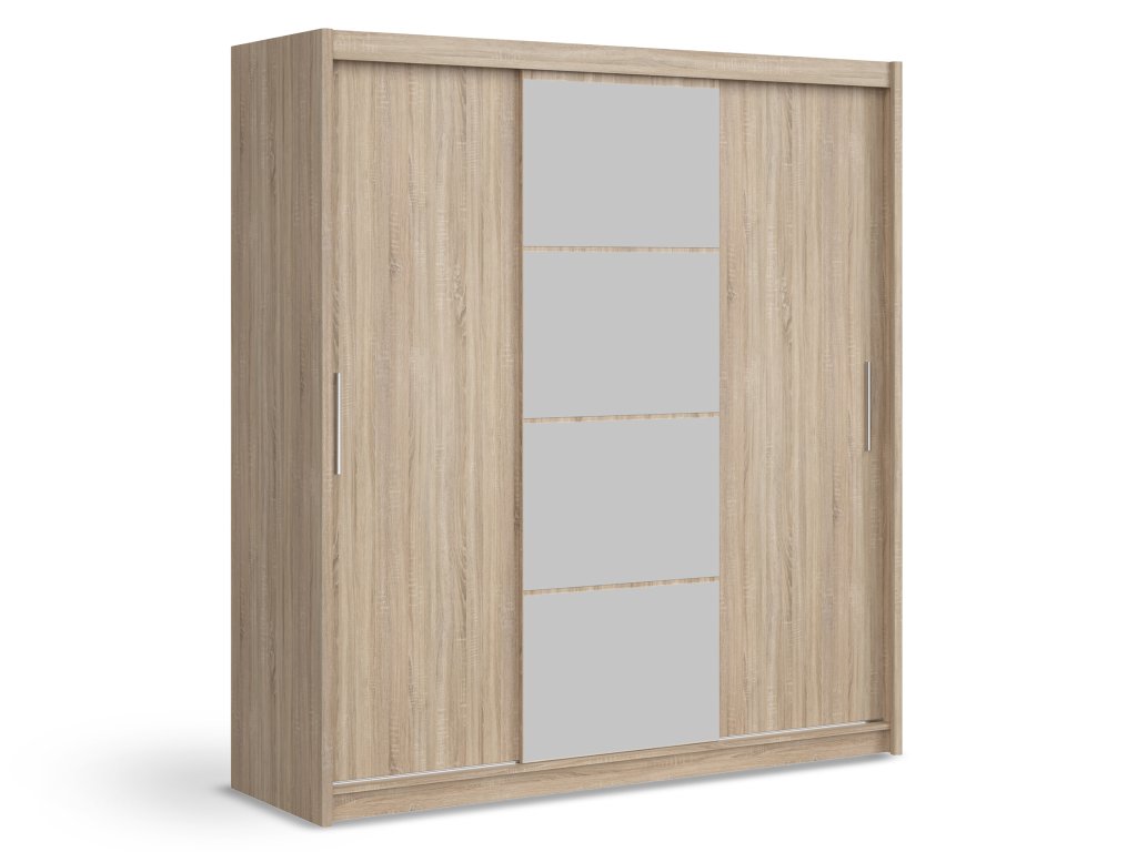 Trojdverová šatníková skriňa Mario prináša praktické a elegantné riešenie úložného priestoru do spálne či predsiene. Prednú časť skrine zdobia troje dvere, pričom stredné sú doplnené veľkým zrkadlom, ktoré opticky zväčšuje miestnosť a zároveň vytvára zaujímavý vizuálny prvok. Vnútorné usporiadanie skrine je premyslené a rozdelené do troch funkčných častí. Na jednej strane sa nachádzajú police, ideálne na poskladané oblečenie alebo doplnky. Stredná časť ponúka praktickú kombináciu vešiakovej tyče a dvoch zásuviek, kam môžete uložiť drobnejšie kúsky či doplnky. Druhá strana je vybavená vešiakovou tyčou a hornou policou, ideálnou na kabáty, šaty alebo sezónne oblečenie.