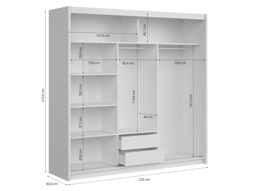 Predĺžené plastové úchytky elegantne podčiarkujú čisté línie skrine a jej moderný vzhľad. Zásuvky sú vybavené kolieskovými výsuvmi pre hladké a tiché používanie, zatiaľ čo posuvné vedenie dverí zabezpečuje jednoduché a spoľahlivé otváranie. Kvalitné materiály a precízne spracovanie zaručujú dlhú životnosť a odolnosť nábytku.