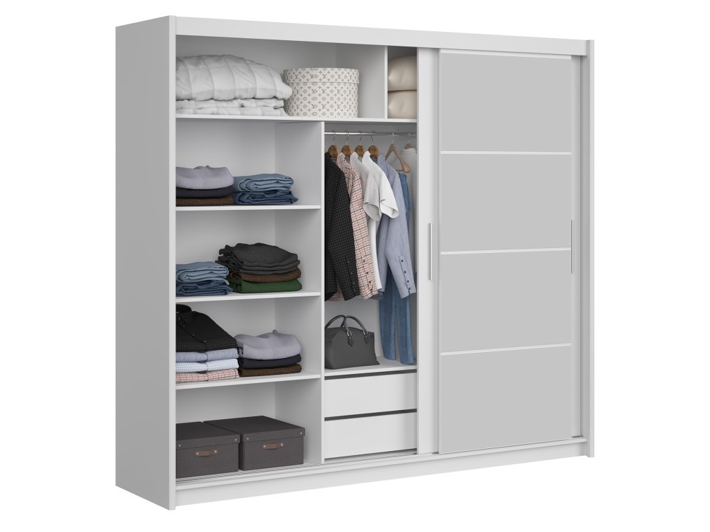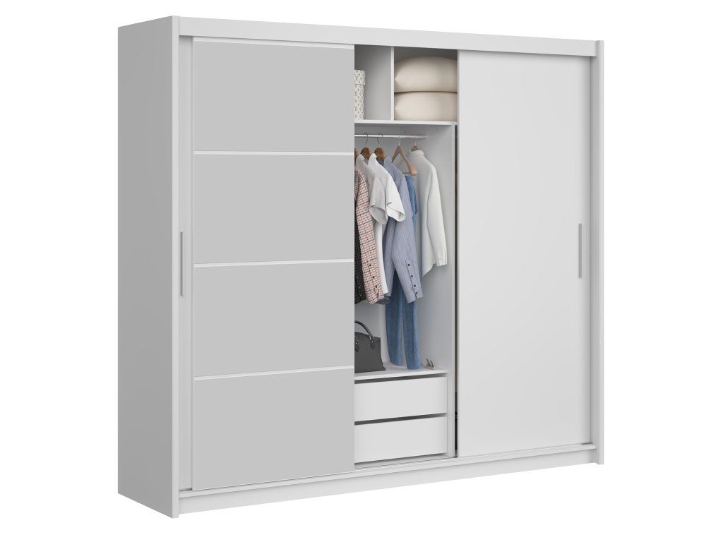 Predĺžené plastové úchytky zdôrazňujú čisté línie skrine a moderný dizajn. Zásuvky sú vybavené kolieskovými výsuvmi, ktoré umožňujú tiché a pohodlné otváranie, zatiaľ čo posuvné vedenie dverí zabezpečuje hladký chod a spoľahlivosť. Korpus a predné plochy sú vyrobené z pevnej laminovanej drevotriesky, ktorá zaručuje odolnosť a dlhú životnosť nábytku.