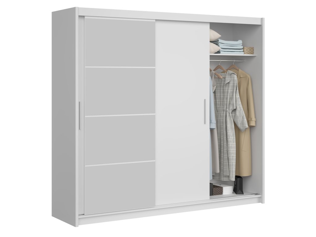 Biela šatníková skriňa Marios v trojdverovom prvedení prináša do spálne alebo predsiene pocit svetla, poriadku a prehľadnosti. Stredné dvere sú doplnené zrkadlom, ktoré opticky zväčšuje miestnosť a uľahčuje každodenné obliekacie rituály. Biely dekor dodáva interiéru sviežosť, nadčasovosť a ľahko sa kombinuje s ostatným nábytkom. Vnútorné rozloženie skrine je premyslené a praktické. Na jednej strane sa nachádzajú police vhodné na poskladané oblečenie alebo doplnky. Stredná časť obsahuje vešiakovú tyč a dve zásuvky, kde môžete uložiť spodnú bielizeň, drobnosti či sezónne doplnky. Druhá strana skrine je vybavená vešiakovou tyčou s hornou policou, ideálnou na kabáty, šaty alebo sezónne oblečenie. Tento veľký úložný priestor poskytuje komfort aj do spálne s množstvom oblečenia.