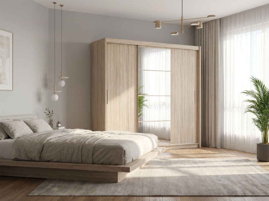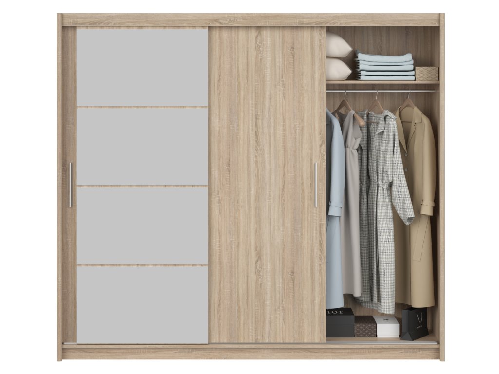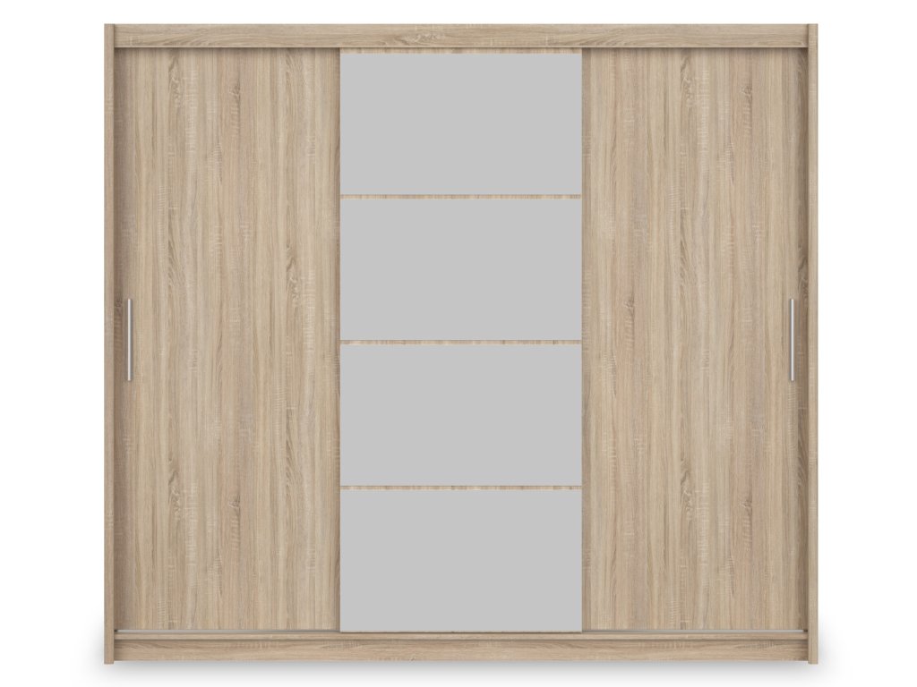 Chcete mať svoju spálňu alebo predsieň vždy upratanú a štýlovú? Trojdverová šatníková skriňa Marios v dekore dub sonoma prináša kombináciu teplého, prírodného vzhľadu a praktického úložného priestoru. Stredné dvere sú doplnené zrkadlom rozdeleným do štyroch častí, ktoré opticky zväčšuje miestnosť a zároveň uľahčuje každodennú prípravu. Dubový dekor dodáva interiéru sviežosť a nadčasovosť, vďaka čomu skriňa harmonicky ladí s ostatným nábytkom. Vnútorné usporiadanie skrine je premyslené a funkčné. Na jednej strane sú police ideálne na poskladané oblečenie, doplnky alebo posteľnú bielizeň. Stredná časť ponúka dve praktické zásuvky a vešiakovú tyč, kam môžete uložiť drobnejšie kúsky oblečenia alebo príslušenstvo. Druhá strana obsahuje vešiakovú tyč s hornou policou, vhodnú na kabáty, šaty či sezónne oblečenie. Takto získate prehľadný, veľkorysý a pohodlný úložný priestor aj pre väčšie spálne či predsiene.
