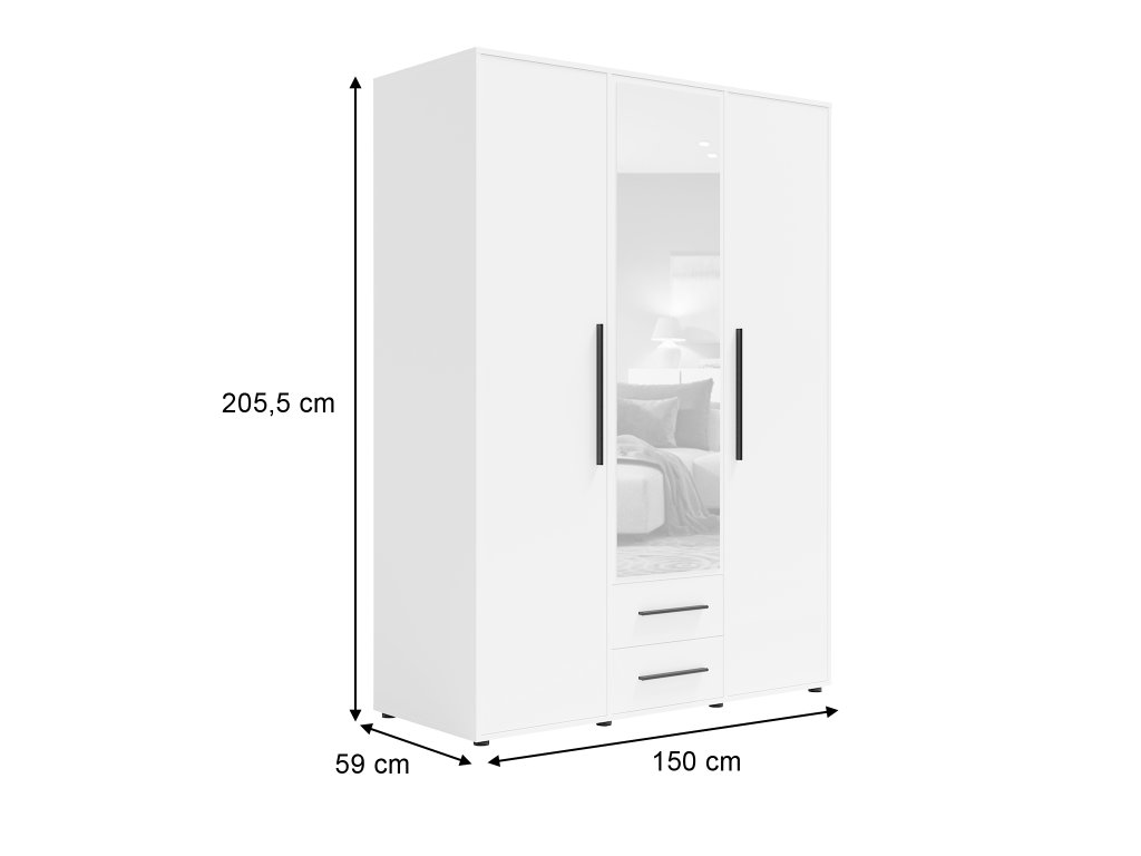 Kašmírová šatníková skriňa Maxione je kombináciou moderného dizajnu a praktickosti, vhodná do spálne alebo predsiene. Pantové dvere so zrkadlom a čierne PVC úchyty dodávajú elegantný vzhľad, zatiaľ čo nožičky zabezpečujú stabilitu a chránia podlahu. Vnútro skrine je premyslené – dve zásuvky, päť políc a tyče na oblečenie umožňujú efektívne a prehľadné usporiadanie oblečenia, doplnkov či iných drobností, takže každý kúsok má svoje miesto a priestor zostáva uprataný.