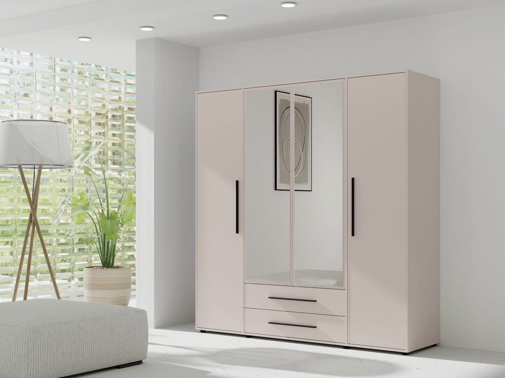 Skriňa je vyrobená z pevného laminátu odolného voči vlhkosti a každodennému používaniu. Kombinácia laminovanej dosky a HDF materiálu zabezpečuje stabilitu, pevnosť a dlhú životnosť bez deformácií či odlupovania. Údržba je jednoduchá – stačí povrch utrieť vlhkou handričkou alebo čistiacim prostriedkom. Kašmírová štvordverová skriňa Maxione je tak praktickým a vizuálne atraktívnym riešením pre moderný interiér.