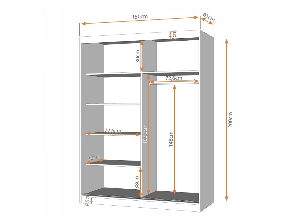 Viacúčelová šatníková skriňa 150 Valery II je vhodná aj do menších priestorov, chodby, študentskej či detskej izby. Priestranná skriňa je vyrobená z kvalitnej laminovanej dosky o hrúbke 16 mm s hliníkovými lištami. Vnútorné členenie je vyhotovené tak, aby uspokojilo aj náročnejšieho zákazníka. Skriňa je vybavená šiestimi širokými policami a jednou vešiakovou tyčou. Skriňu je možné zakúpiť vo viacerých farebných prevedeniach.