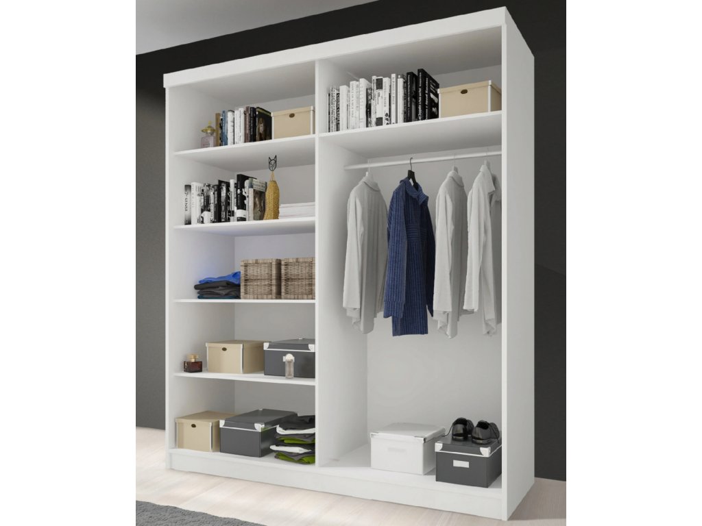 Šatníková skriňa 150 Valery III je vďaka jej praktickým posuvným dverám vhodná aj do menších priestorov. Zapasuje do chodby, predsiene, študentskej či detskej izby, ale aj spálne. Na výrobu praktickej skrine bola použitá kvalitná laminovaná doska o hrúbke 16 mm s odolnými ABS hranami. Na kvalite skrine sa podieľajú aj hliníkové lišty a kovový posuvný systém dverí s valčekovými ložiskami. Vnútorné členenie skrine je vešiakové i policové, čím uspokojí aj náročnejšieho zákazníka. Skriňa je totiž vybavená šiestimi veľkými odkladacími plochami a jednou širokou vešiakovou tyčou. Veľké zrkadlo miestnosť rozžiari a opticky zväčší.