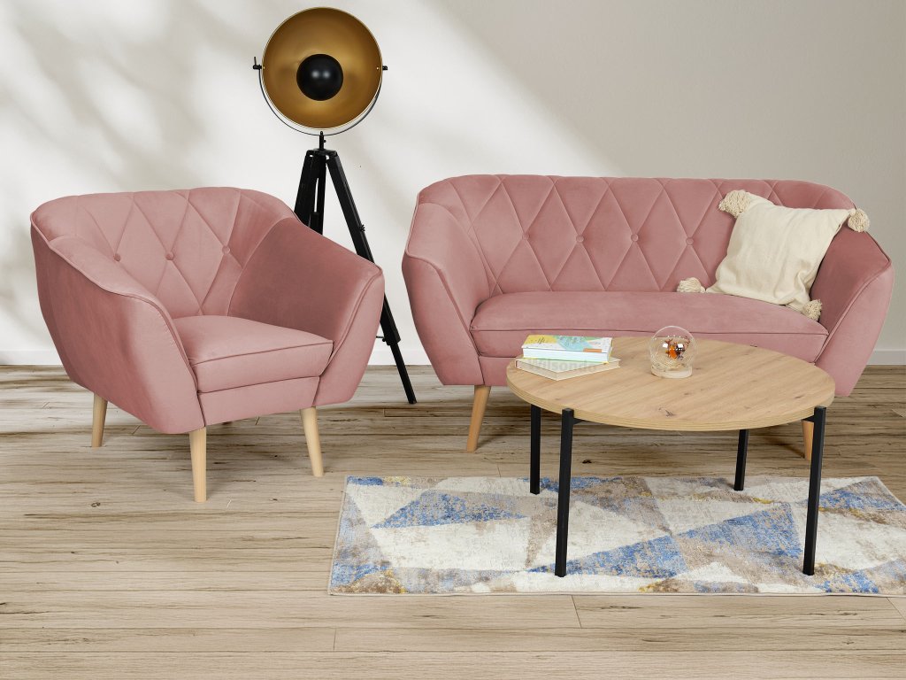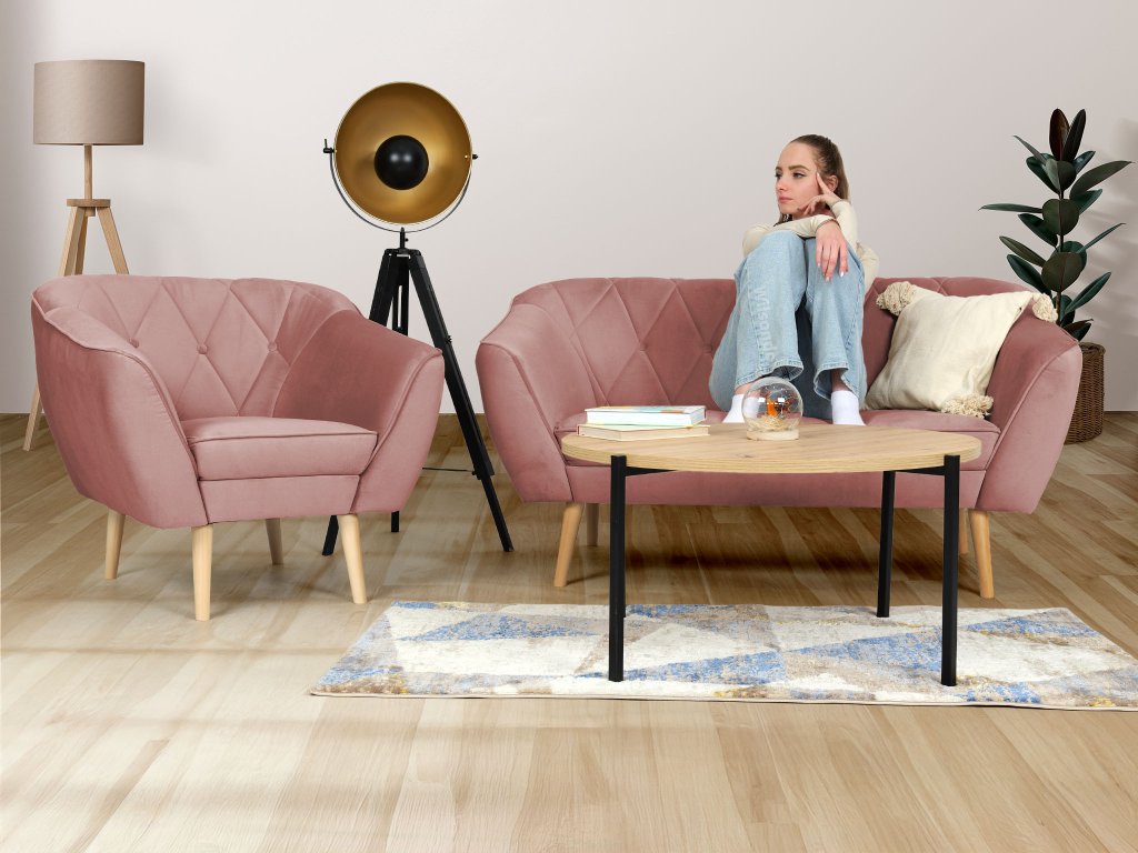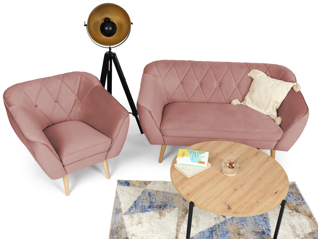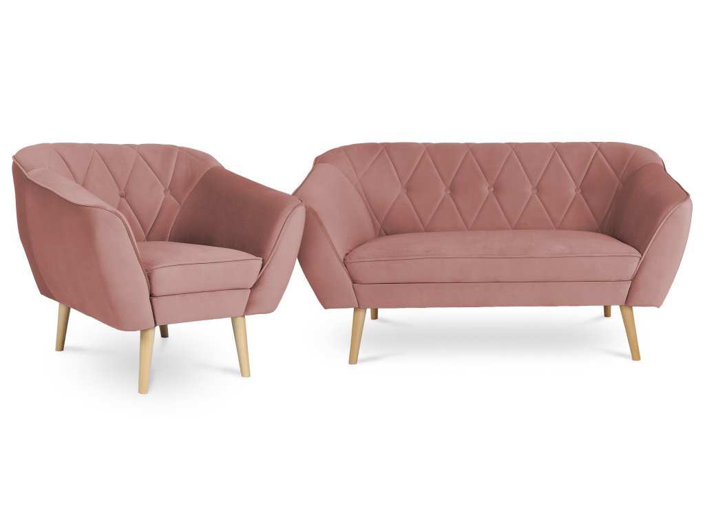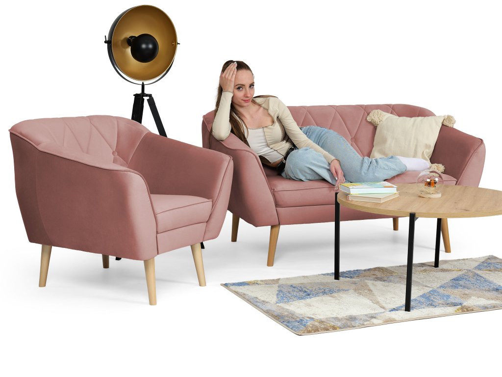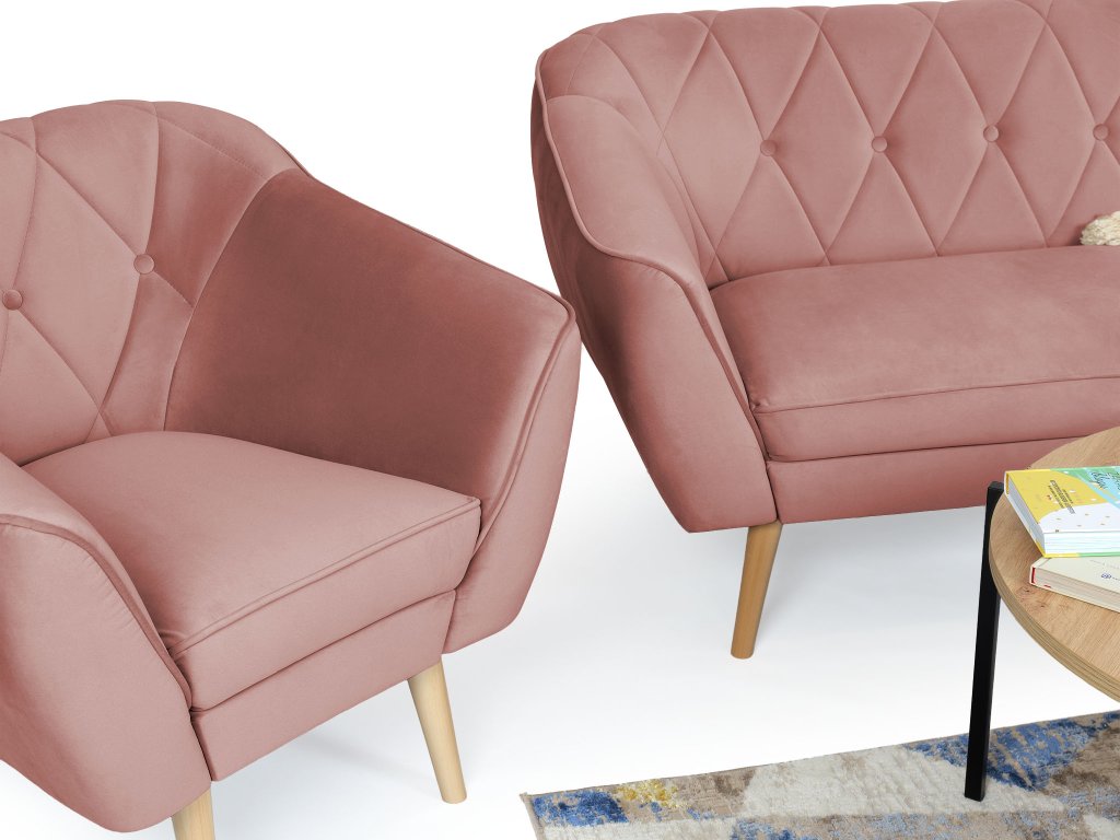Celá súprava stojí na drevených nožičkách, ktoré podčiarkujú škandinávsky štýl a dodávajú nábytku ľahkosť. Ružový poťah nie je len krásny na pohľad – je aj praktický. Látka Velur Royal je odolná voči žmolkovaniu, príjemná na dotyk a jednoducho sa čistí – stačí vlhká handrička alebo jemný nástavec vysávača.