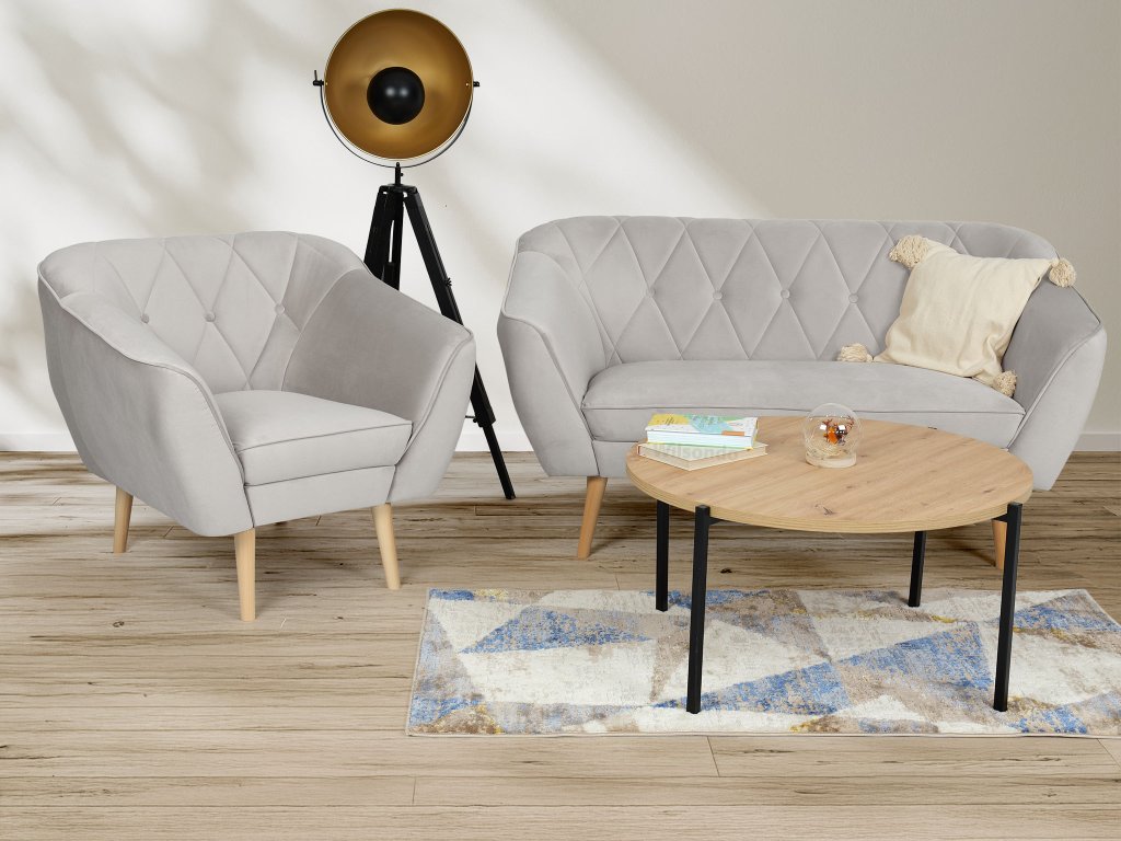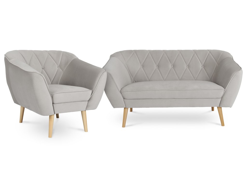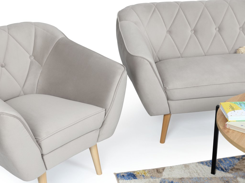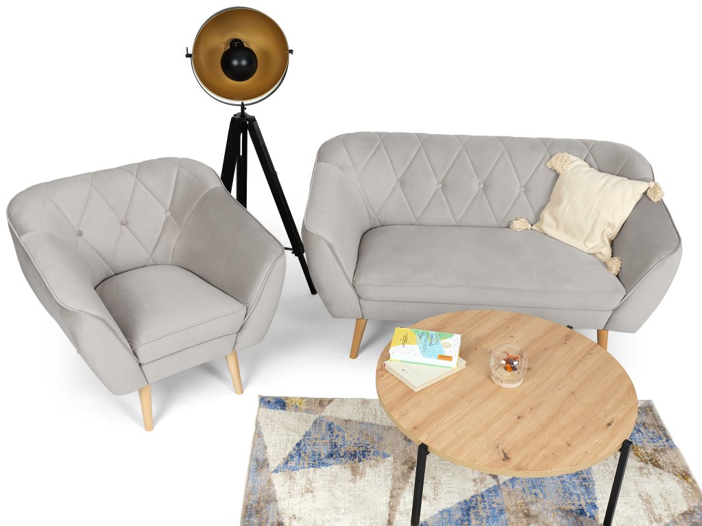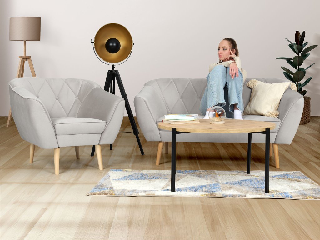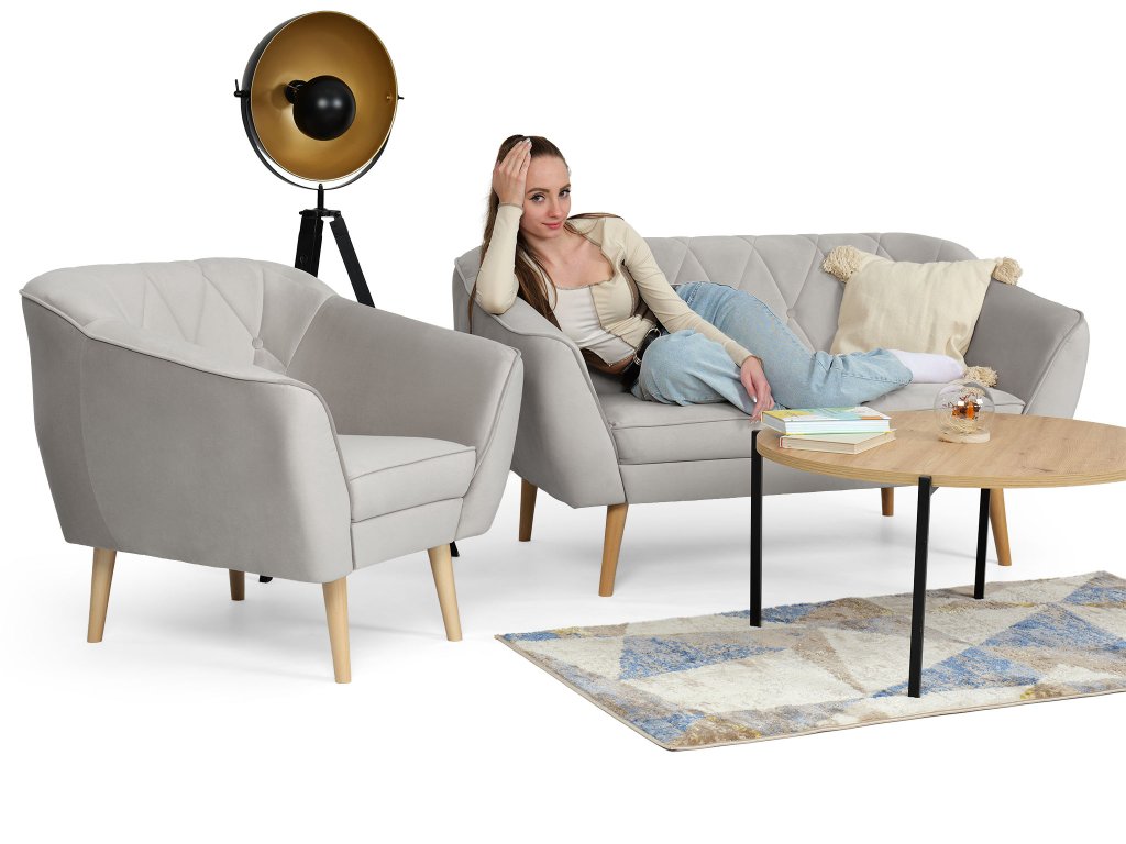Základom stability a ľahkosti sú nožičky z prírodného dreva, ktoré vizuálne odľahčujú celý set. Sivá látka Velur Royal je mäkká, príjemná na dotyk a odolná voči žmolkovaniu. Navyše sa jednoducho čistí – stačí jemne navlhčená handrička alebo vysávač s nástavcom na čalúnený nábytok.