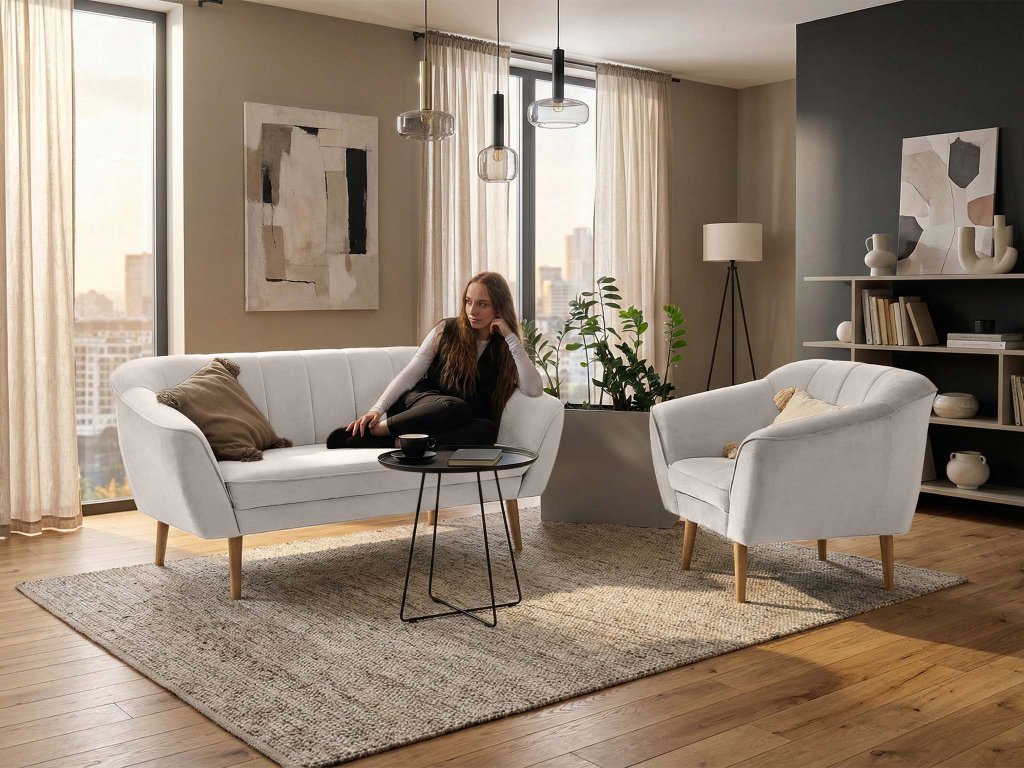 Táto pohodlná sedacia súprava je ideálna do menších obývačiek, bytov alebo štýlových kancelárií. Kreslo môže slúžiť na čítanie alebo samostatný oddychový prvok. Celá sedacia súprava s kreslom vytvára harmonický oddychový priestor pre dvoch bez zbytočného zahltenia miestnosti.