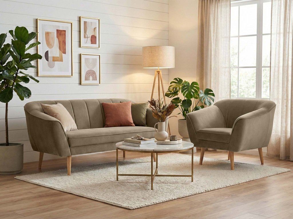 Svetlohnedá sedacia súprava 2+1 vynikne s konferenčným stolíkom z dreva alebo s kovovými detailmi. Priestor zútulnia mäkké vankúše a deky, prípadne koberec v neutrálnych tónoch, ktorý vizuálne spojí celú miestnosť.