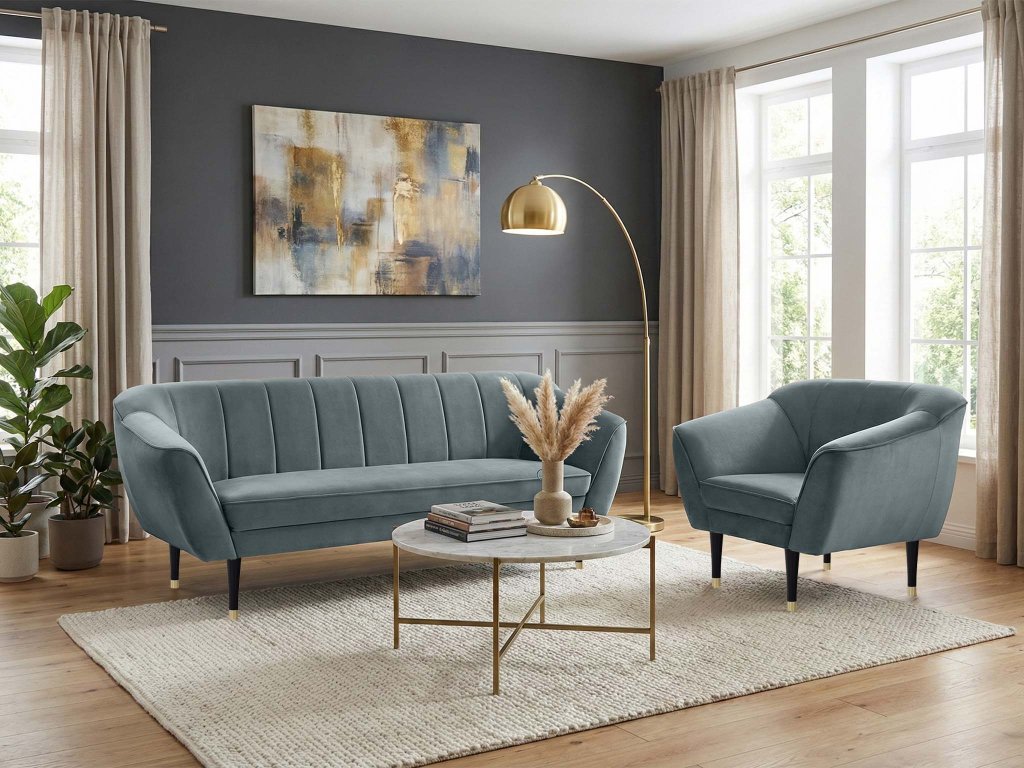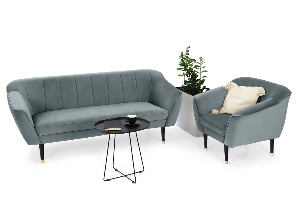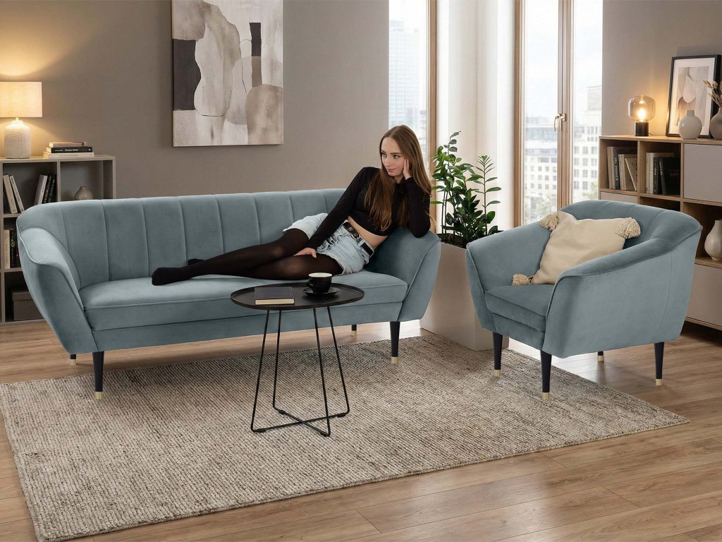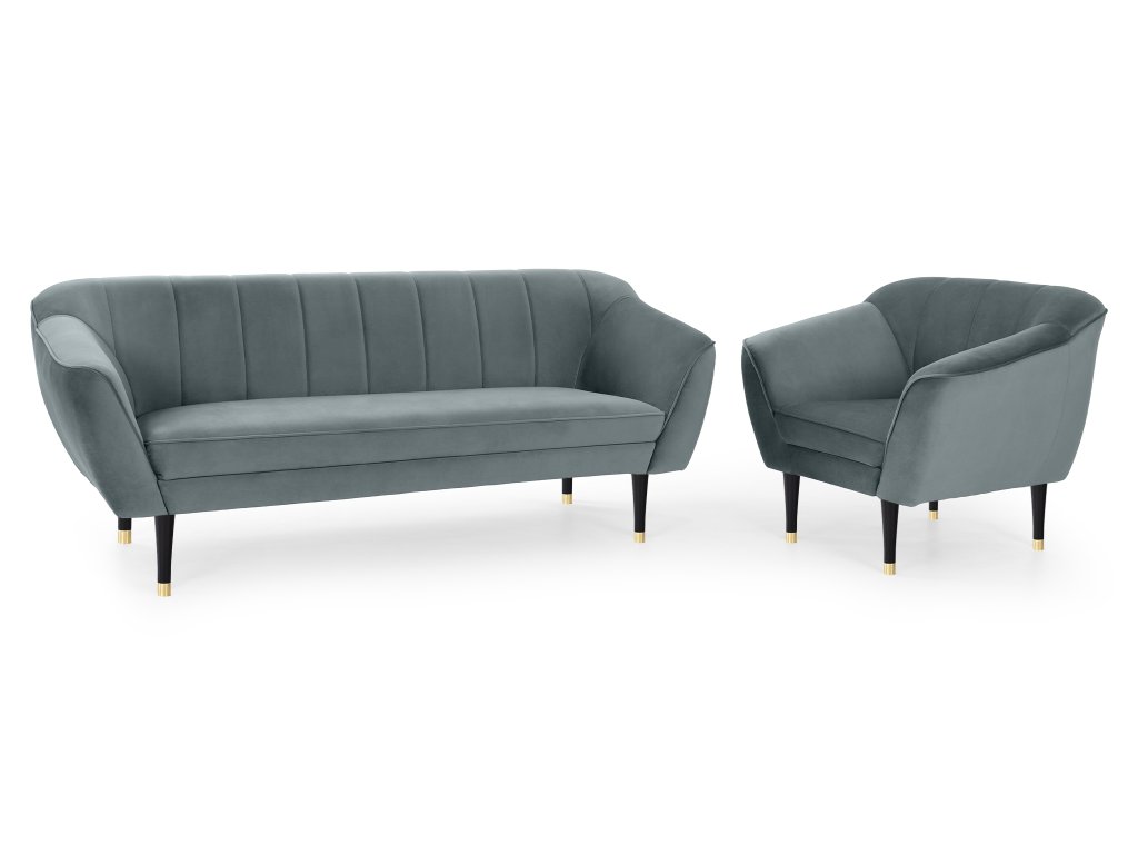 Sada trojmiestnej pohovky a kresla Diva v elegantnom sivom prevedení predstavuje ideálne spojenie moderného dizajnu a pohodlia. Čalúnenie z kvalitnej látky Velur Royal pôsobí luxusne, je príjemné na dotyk, nežmolkuje sa a vyniká vysokou odolnosťou voči oderu. Charakteristické vertikálne prešívanie operadiel, profilované opierky a čierne nožičky so zlatým detailom dodávajú celej sade sofistikovaný vzhľad, vďaka ktorému sa hodí do moderných, glamour aj jemne retro interiérov.