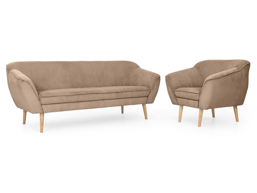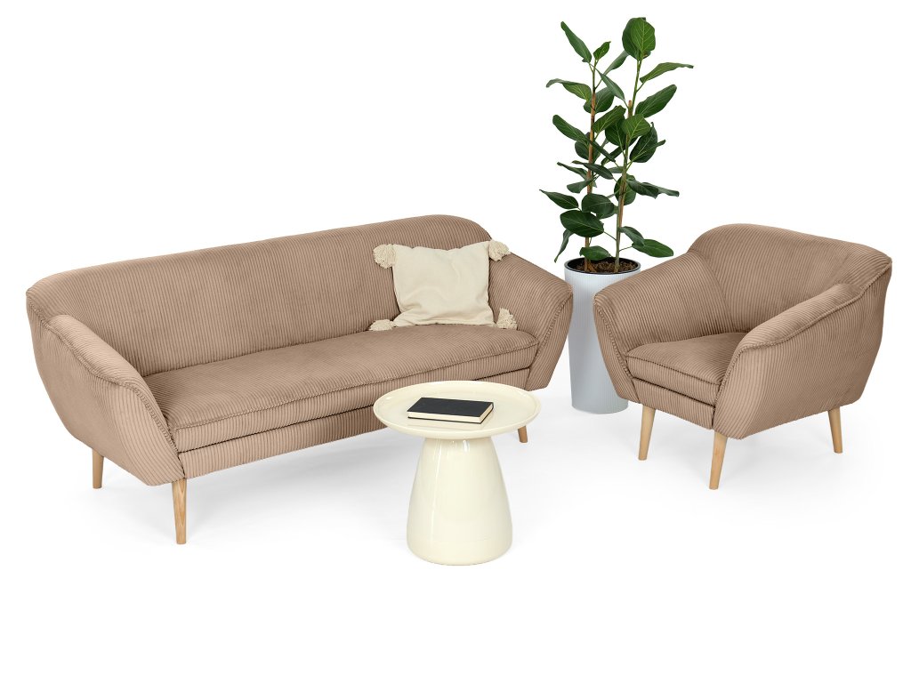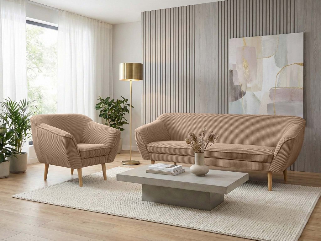Sada dvojmiestnej pohovky a kresla Dory v svetlohnedom prevedení prináša do interiéru prirodzené teplo a nadčasový šarm. Tento jemný, zemitý odtieň pôsobí pokojne a vyvážene, vďaka čomu sa ľahko kombinuje s drevom, kovovými detailmi aj neutrálnou paletou farieb. Dvojmiestna pohovka poskytuje komfortný priestor na každodenný oddych aj spoločné chvíle. Jej elegantne tvarované línie a premyslené proporcie vytvárajú dojem ľahkosti, no zároveň zaručujú stabilitu a pevnosť. Kreslo v rovnakom dizajne dotvára harmonický celok a môže slúžiť ako štýlový solitér alebo súčasť dokonale zladeného setu. Zamatová látka v svetlohnedom tóne zvýrazňuje hĺbku farby a dodáva nábytku sofistikovaný vzhľad. Na dotyk je príjemná a vizuálne pôsobí luxusne, pričom pohodlné čalúnenie zabezpečuje oporu a komfort pri každodennom používaní.