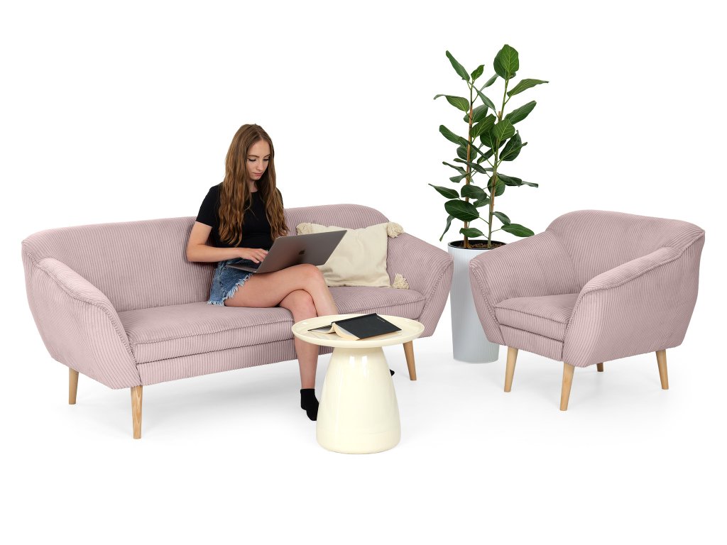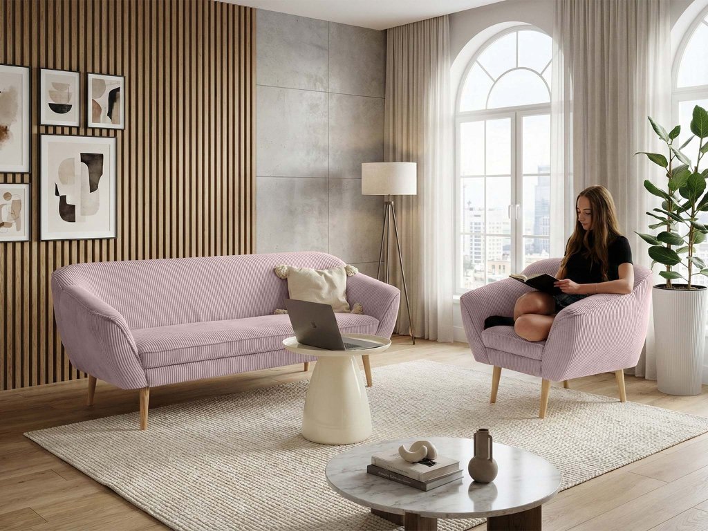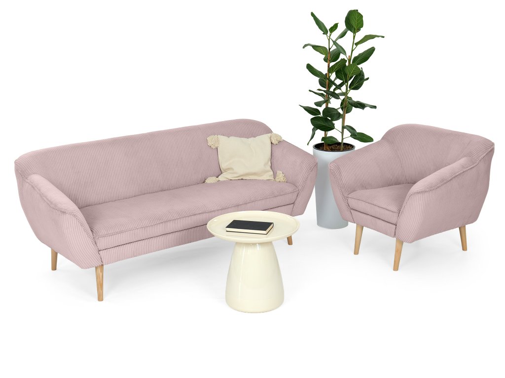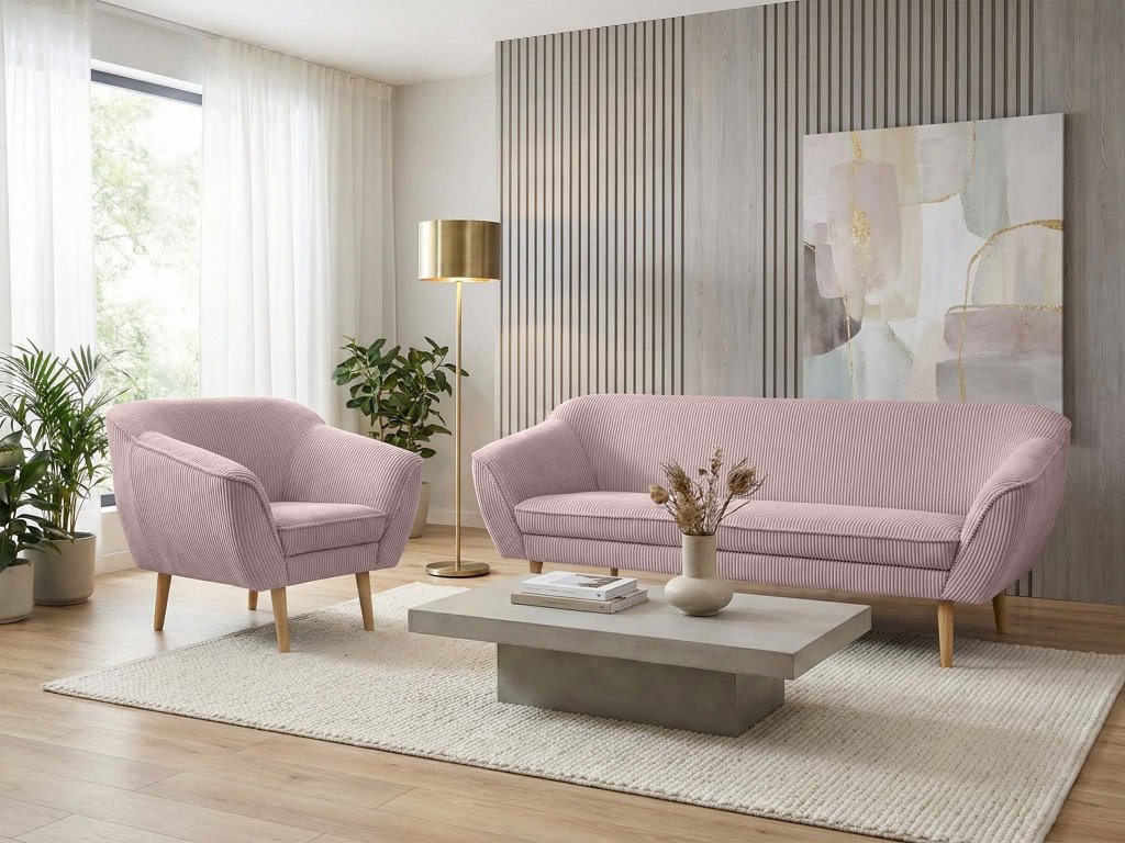 Sada dvojmiestnej pohovky a kresla Dory nie je len o farbe – je o pocite, ktorý vytvára. Jemný ružový odtieň dodáva interiéru svetlo a nežnosť, zatiaľ čo samotná silueta nábytku prináša modernú vyváženosť medzi eleganciou a pohodlím. Dvojmiestna pohovka ponúka ideálny priestor na každodenný oddych aj príjemné chvíle vo dvojici. Jej čisté línie a harmonické proporcie pôsobia ľahko, no zároveň stabilne a pevne. Kreslo v rovnakom dizajne vytvára dokonale zladený celok – či už ho umiestnite vedľa pohovky alebo ako samostatný akcentový prvok v priestore. Hebká zamatová látka je príjemná na dotyk a zvýrazňuje hĺbku ružového tónu, ktorý sa mení podľa dopadu svetla. Jemný lesk dodáva nábytku nádych luxusu, zatiaľ čo pohodlné čalúnenie poskytuje oporu a komfort pri každodennom používaní. Dory je kombináciou štýlu a funkčnosti – pohovka, ktorá zútulní priestor, a kreslo, ktoré sa stane vaším obľúbeným miestom na oddych.