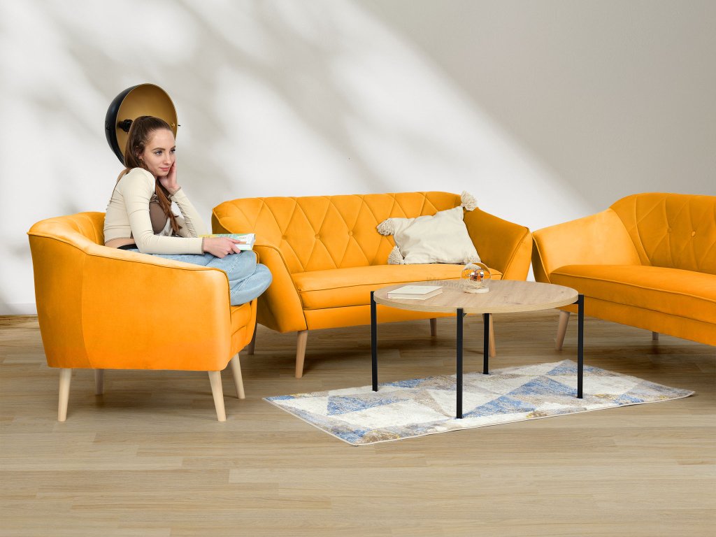 Sedacia súprava Deana v pestrej oranžovej farbe oživí každú obývačku, do ktorej prinesie moderný dizajn. Súprava obsahuje trojmiestnu pohovku, dvojmiestnu pohovku a kreslo. Je vyrobená z kvalitných materiálov, vďaka čomu je odolná a dlho si zachová svoj pôvodný vzhľad. Operadlá sú vyplnené penou T25 a sedadlá penou T30, ktoré spoločne zaručujú maximálny komfort pri sedení aj dlhšom odpočinku. Súprava má drevené nožičky v neutrálnej farbe, ktoré jej dodávajú elegantný vzhľad a zároveň uľahčujú upratovanie pod nábytkom. Sedaciu súpravu Deana môžete využiť v obývacej izbe, kde ju stačí doplniť konferenčným stolíkom a vytvoríte tak dokonalú oddychovú zónu pre celú rodinu.