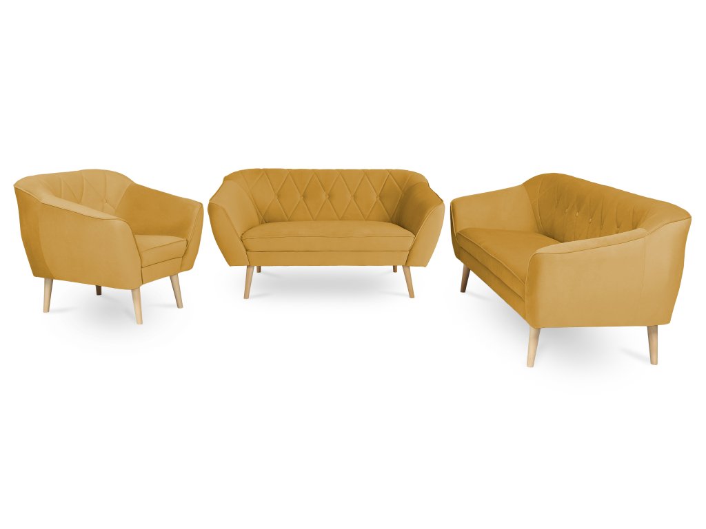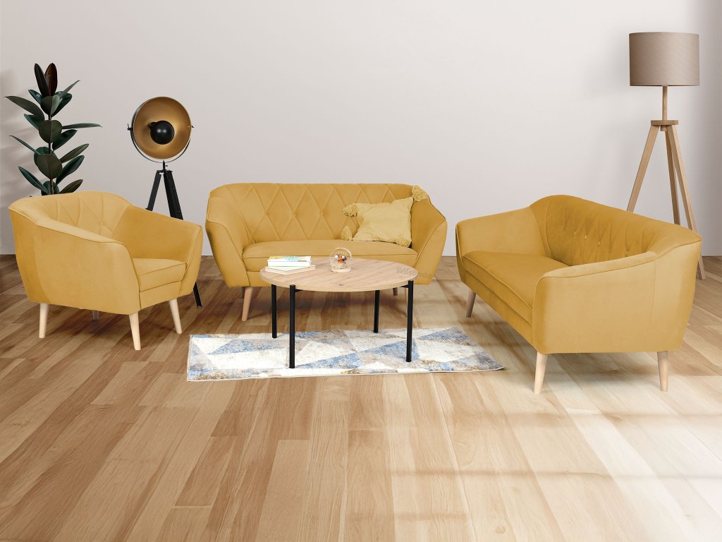 Hľadáte modernú a pohodlnú sedaciu súpravu? Táto sedacia zostava Deana v modernej žltej farbe je tou pravou nábytkovou zostavou do vašej domácnosti. Praktický set pozostáva z trojmiestnej a dvojmiestnej pohovky plus kresla, čo zaisťuje dostatok priestoru pre každého člena rodiny, priateľov či návštevy. Nábytok je čalúnený látkou Royal, ktorá je nielen príjemná na dotyk, ale aj extrémne pevná a odolná, vďaka čomu si súprava udrží svoj vzhľad po dlhé roky. Komfort sedenia zaručuje pena T30 v sedadlách a pena T25 v operadlách, poskytujúca výbornú oporu chrbta. Stabilitu udržiavajú drevené nožičky v prírodnej drevenej farbe. Set Deana sa hodí do každej obývačky. Stačí pridať konferenčný stolík a máte perfektný priestor na oddych aj trávenie času s rodinou.