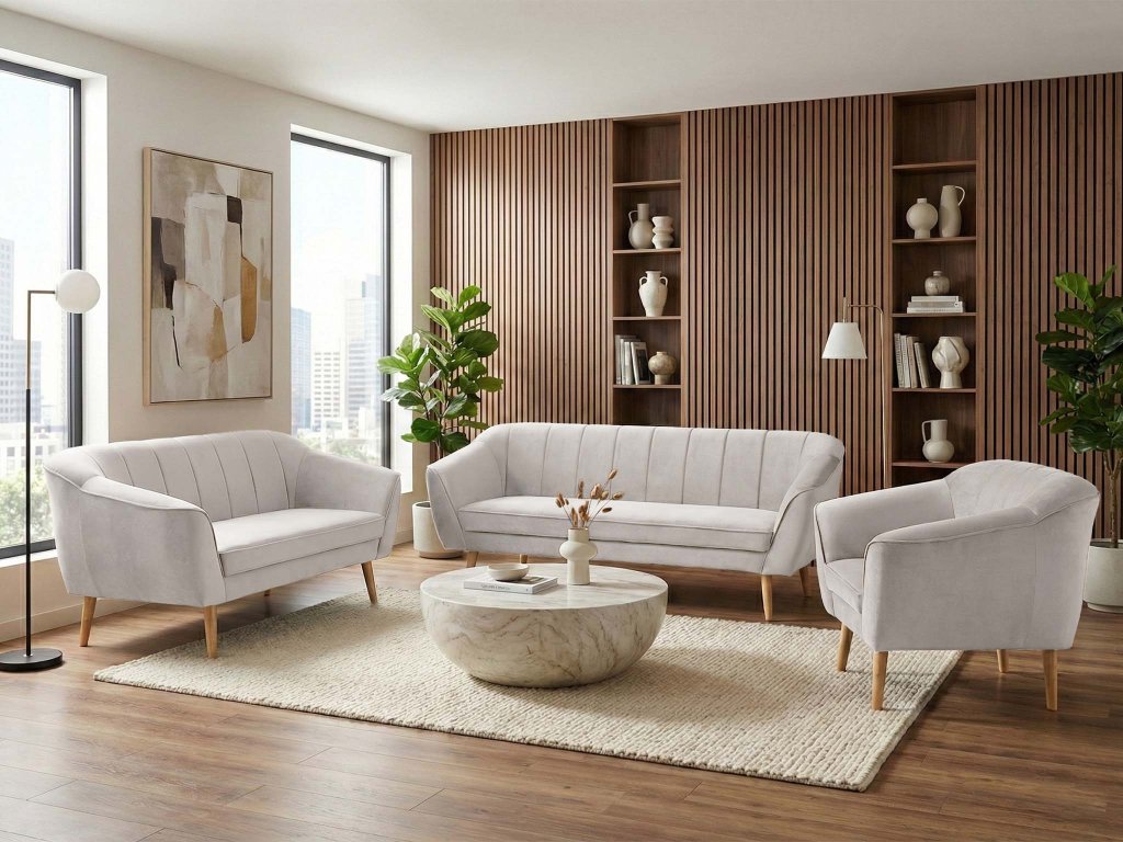 Sedacia súprava 3+2+1 Diva – piesková: Spojenie hrejivého zamatu a prírodného dreva