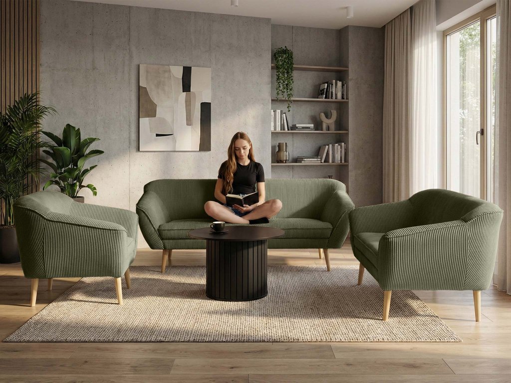 Výhodou tohto setu je predovšetkým jeho variabilita. Trojmiestnu pohovku dopĺňa dvojmiestna pohovka a komfortné kreslo, čo vytvára ideálne podmienky pre rodinné stretnutia. Robustná kostra z masívu poskytuje potrebnú oporu, zatiaľ čo vysoké nožičky dodávajú nábytku ľahkosť a umožňujú bezproblémové upratovanie. Ak túžite po ešte väčšom pohodlí, k súprave je možné dokúpiť samostatný taburet alebo kreslo ušiak v rovnakom olivovom prevedení pre 100% zladený dizajn.