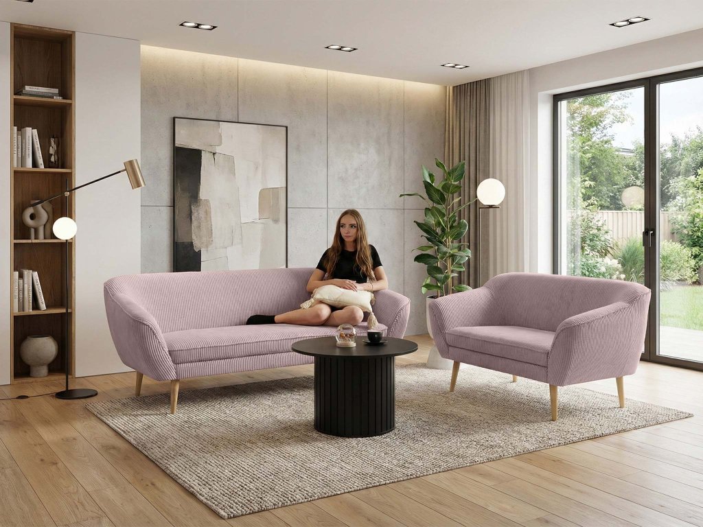 Svetloružová farba pôsobí v kombinácii s menčestrovou textúrou moderne a ľahko sa prispôsobí svetlému aj tmavšiemu nábytku bez toho, aby v priestore pôsobila príliš dominantne. Výborne funguje v kombinácii s neutrálnymi odtieňmi, ako je sivá alebo krémová, ktoré podčiarkujú jej jemnosť, ale vynikne aj v odvážnejších interiéroch s tyrkysovými stenami či doplnkami. K dreveným nožičkám súpravy sa hodia drevené konferenčné alebo príručné stolíky.