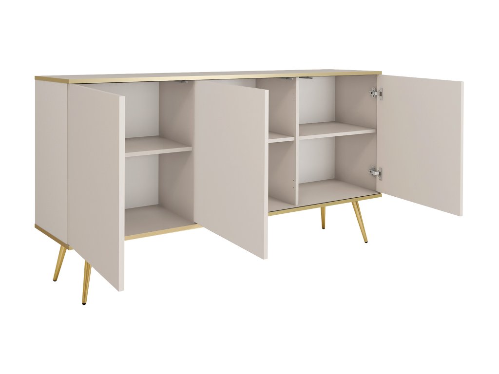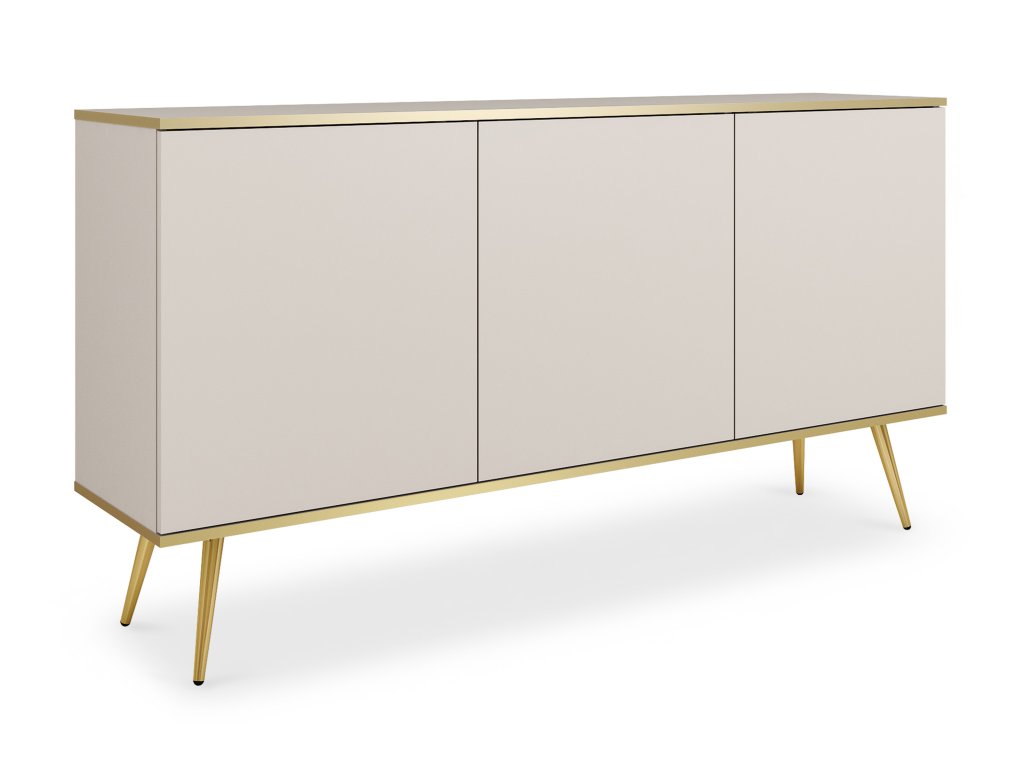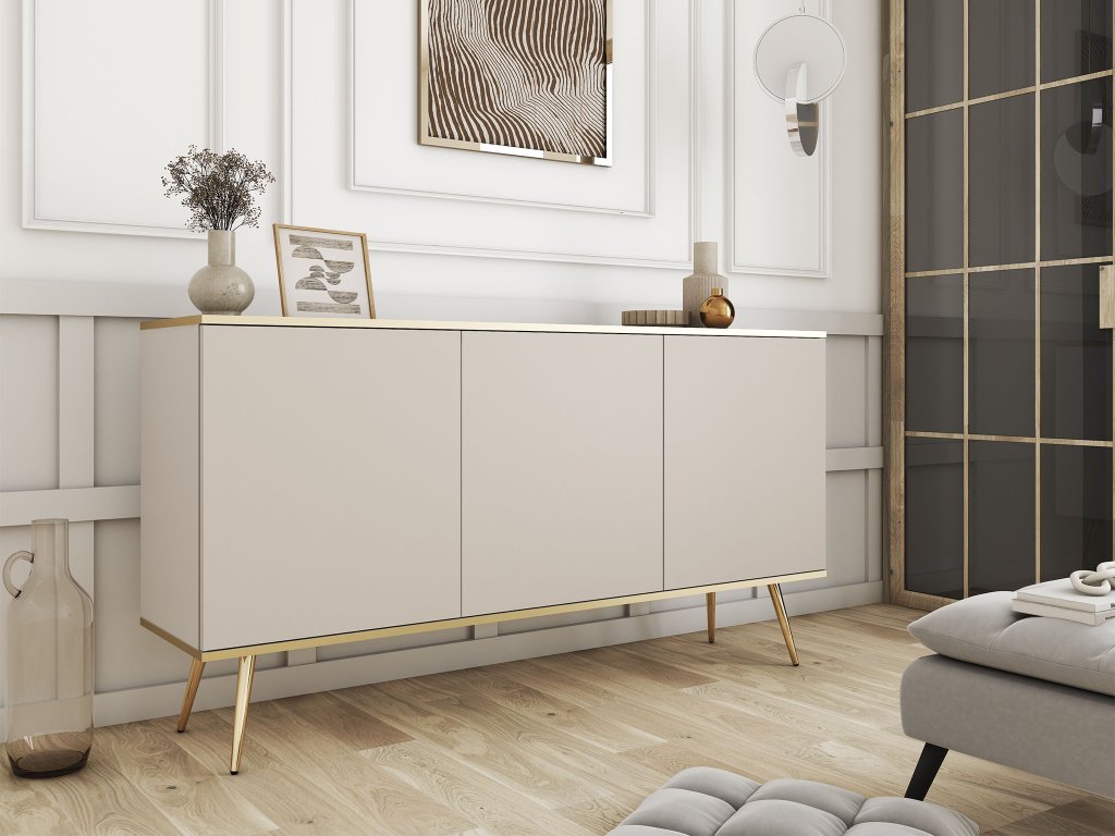 Komoda ORIQUE v elegantnom kašmírovom odtieni zaujme čistými líniami a moderným dizajnom, ktorý vniesie do interiéru svetlo a jemný luxus. Hladké dvierka bez úchytiek vytvárajú uhladený a jednotný vzhľad, zatiaľ čo zlaté nohy a tenká zlatá línia po obvode dodávajú komode sofistikovaný akcent a nenásilný glamour efekt. Prakticky riešený vnútorný priestor s policami poskytuje dostatok miesta na oblečenie, dokumenty či dekorácie, vďaka čomu sa komoda hodí nielen do spálne, ale aj do obývačky či pracovne. Kombinácia vzdušného vzhľadu, pevnej konštrukcie a elegantného štýlu robí z tohto kusu interiérový prvok, ktorý je zároveň funkčný aj dekoratívny.