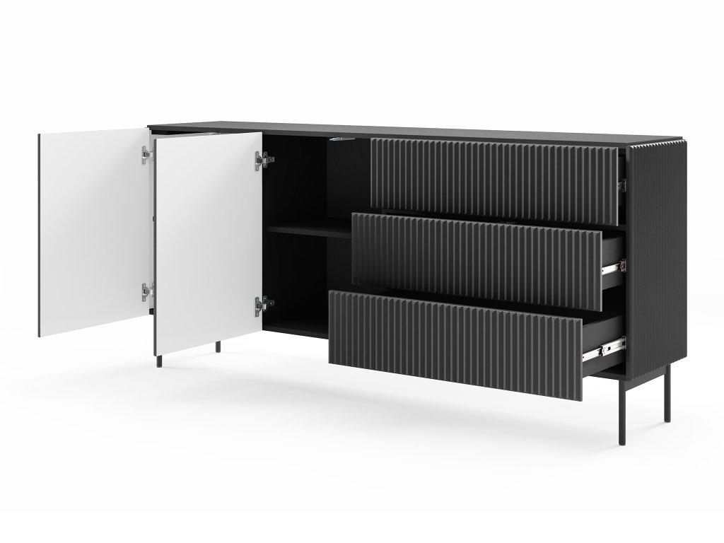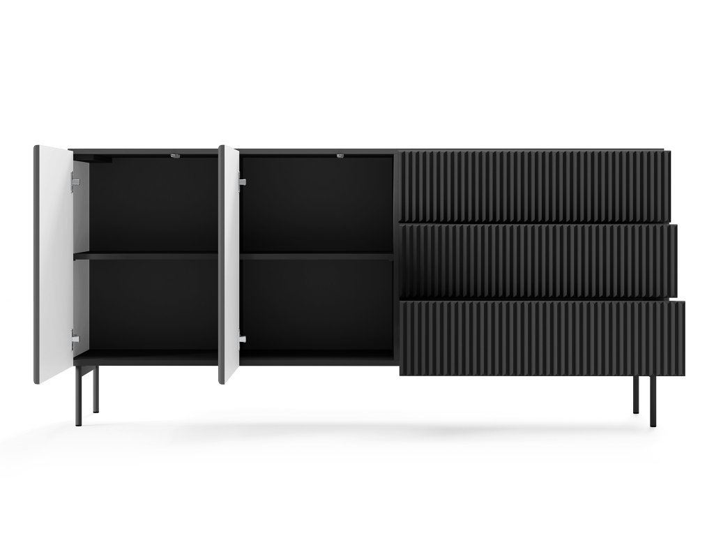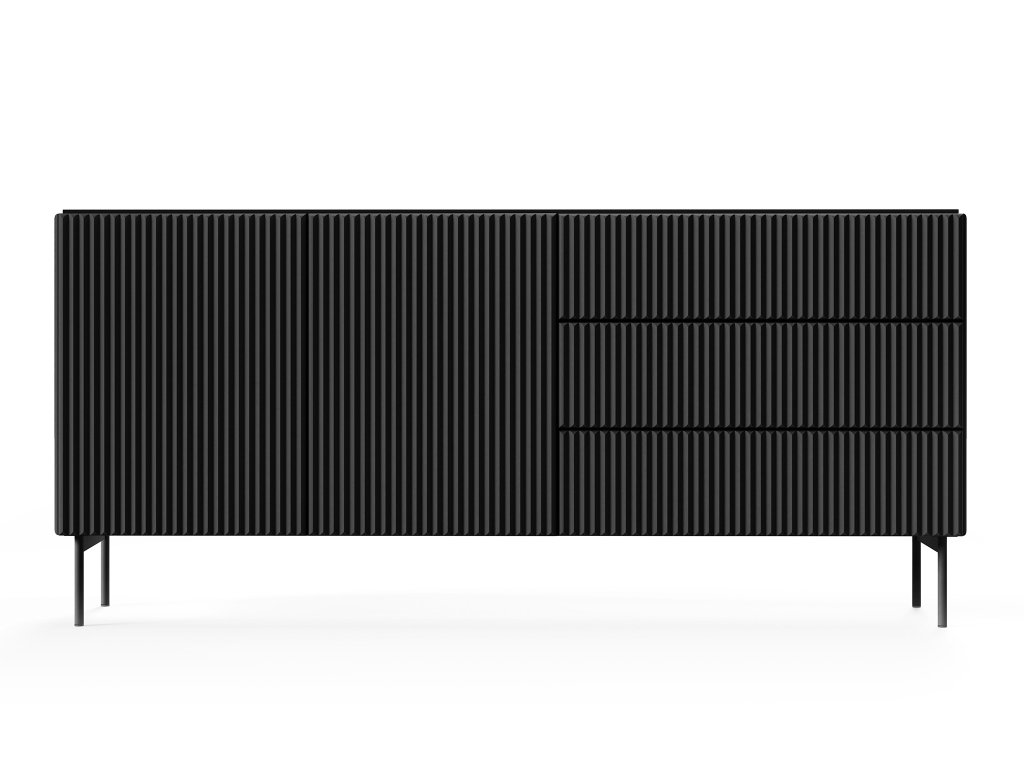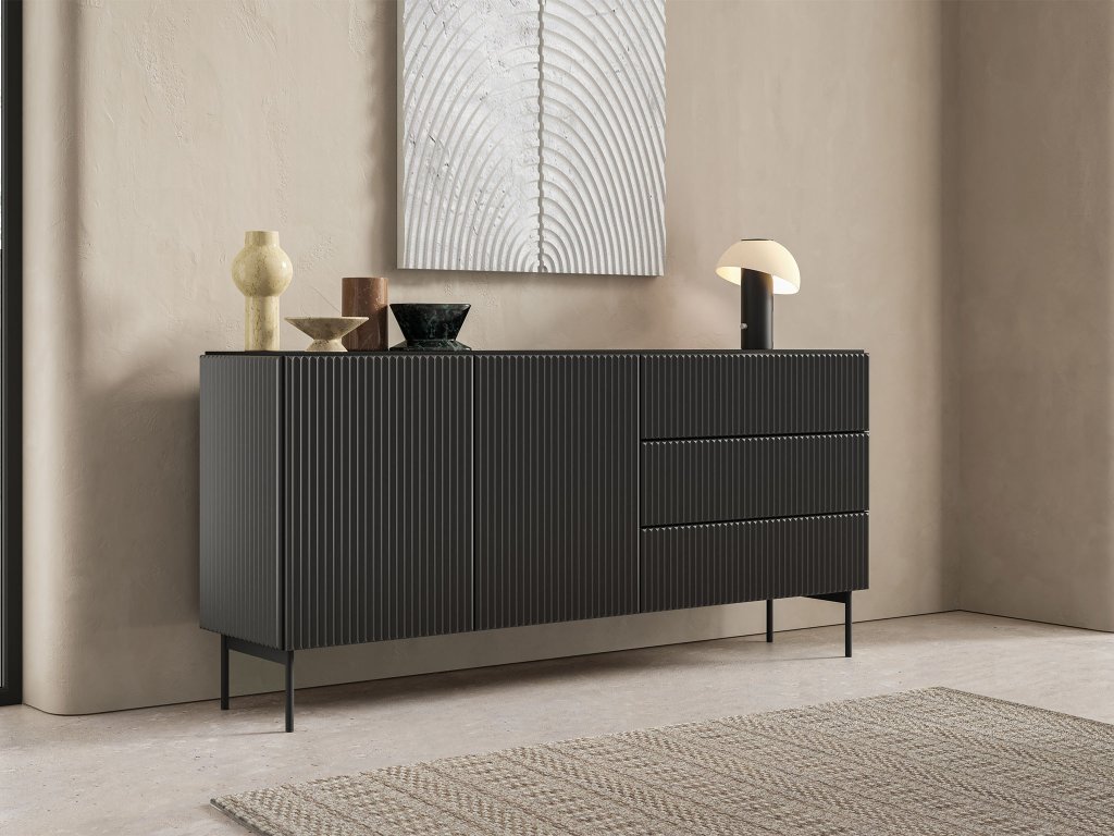 Široká komoda MUTI so zásuvkami prináša moderný dizajn a praktické riešenie úložného priestoru pre každý interiér. Kombinácia drážkovaných čiel a čistých línií vytvára výrazný, nadčasový vzhľad, ktorý okamžite zaujme. V čiernom prevedení pôsobí komoda jemne a elegantne, čo umožňuje jej ľahké zladenie so zvyškom nábytku. Komoda ponúka tri priestranné zásuvky, ideálne na textílie, doplnky či drobnosti, ktoré chcete mať vždy po ruke. Na ľavej strane sa nachádzajú dvoje dvierka s policami, vďaka ktorým získate ešte viac miesta na organizáciu a prehľadné uloženie väčších predmetov.
