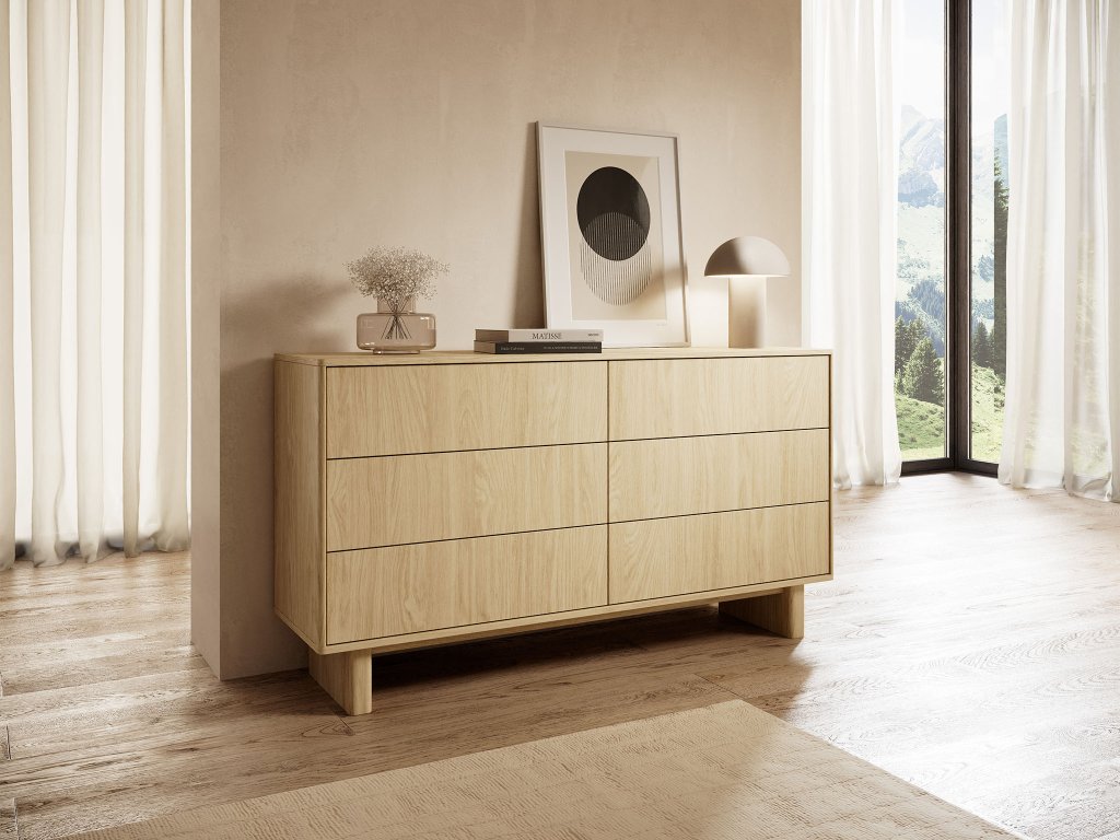 Hľadáte funkčný kus nábytku, ktorý vizuálne nezaťaží priestor a zároveň vyrieši nedostatok úložného miesta? Široká komoda so zásuvkami Nabu v odtieni dub olejovaný je navrhnutá pre milovníkov moderného minimalizmu. So svojou šírkou 153,5 cm a šiestimi zásuvkami ponúka prehľadné rozdelenie vecí v spálni, obývačke či predsieni. Charakteristickým dizajnovým prvkom sú ozdobné zaoblené lišty, ktoré spolu so zaoblenou hornou doskou zjemňujú celkový vzhľad a dodávajú nábytku moderný charakter.