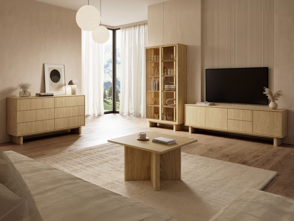 Kolekcia Nabu vyniká precíznym spracovaním aj v miestach, ktoré bežne nevidíte. Zadné dosky and dná zásuviek sú ladené v rovnakom odtieni dub olejovaný, čo vytvára esteticky zladený celok pri každom otvorení a zabezpečuje vizuálnu jednotu celého interiéru. Všetky komody a TV stolíky sú vybavené zásuvkami s guľôčkovým vedením a plnovýsuvom, takže sa bez problémov dostanete aj k veciam uloženým úplne vzadu. Namáhané hrany sú chránené ABS páskou vo farbe dosky, ktorá zvyšuje odolnosť voči každodennému používaniu. Či už si vyberiete štvorcový alebo okrúhly konferenčný stolík, celá zostava bude v interiéri pôsobiť harmonicky a prepojene. Nabu je skrátka ideálnou voľbou pre každého, kto túži po moderne zariadenom domove, v ktorom sa spája nekompromisná kvalita s útulným vyžarovaním prírodného dekoru.