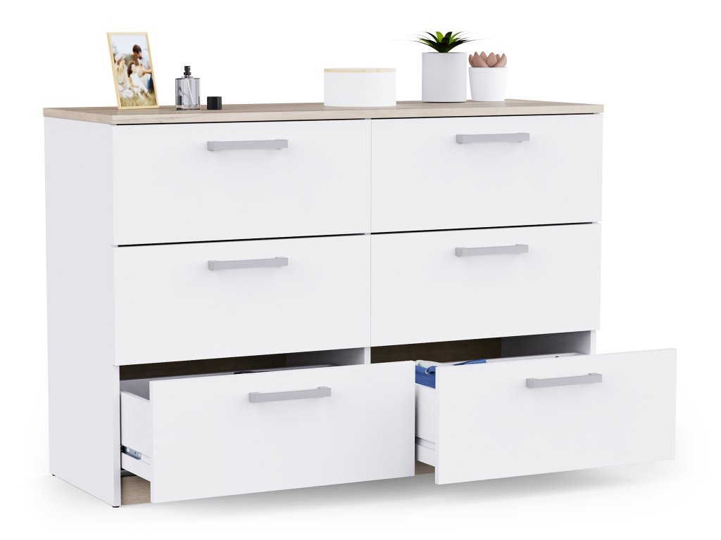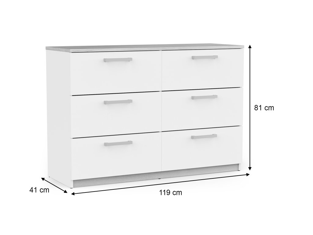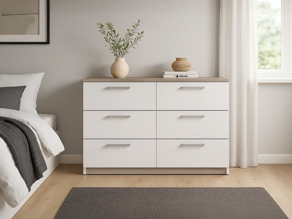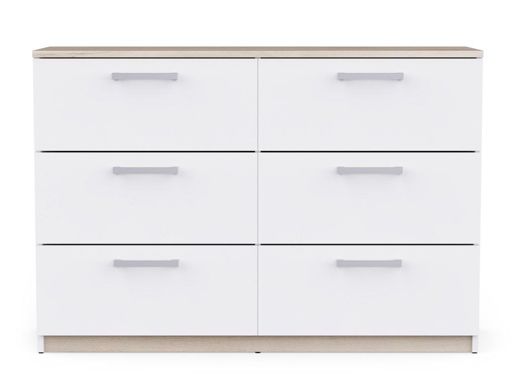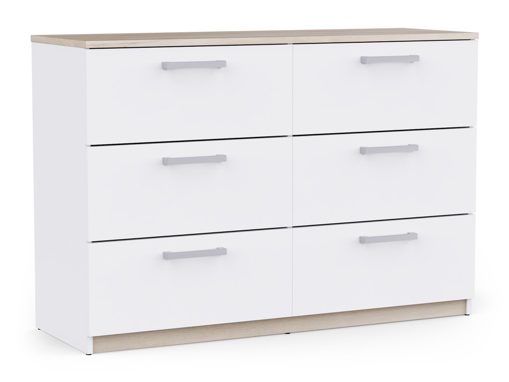 Ponúka 6 priestranných zásuviek, ktoré poskytujú dostatok miesta na oblečenie, dokumenty aj drobnosti každodenného života. Čisté línie a kontrastné úchytky dodávajú komode vizuálnu ľahkosť aj charakter.