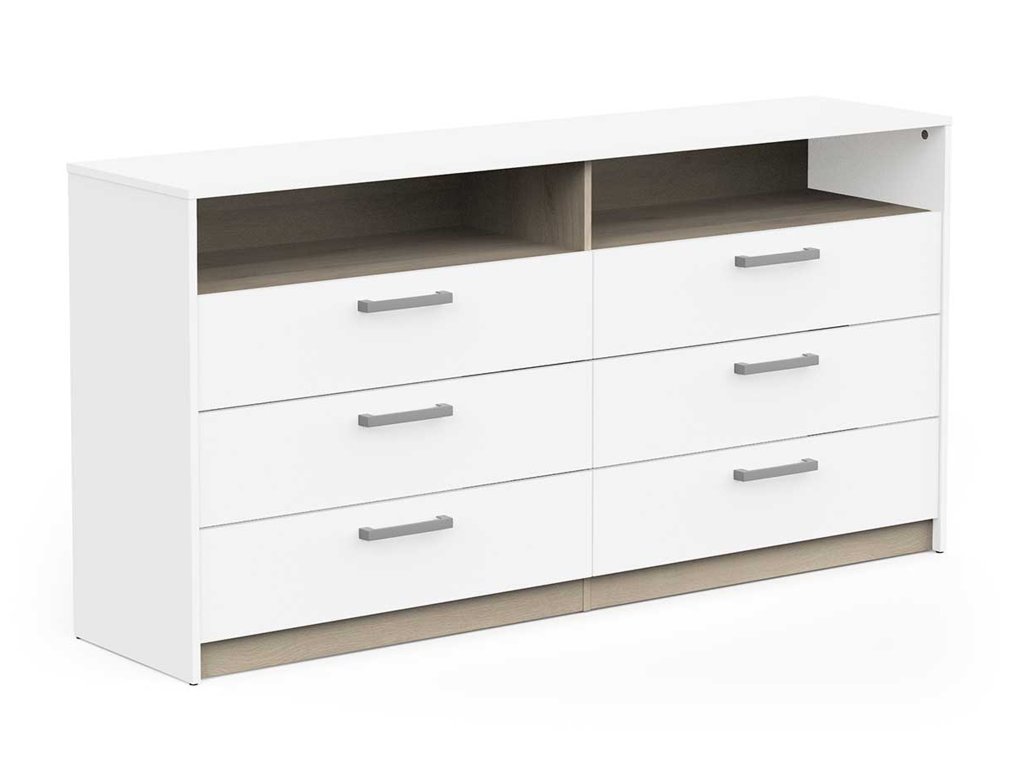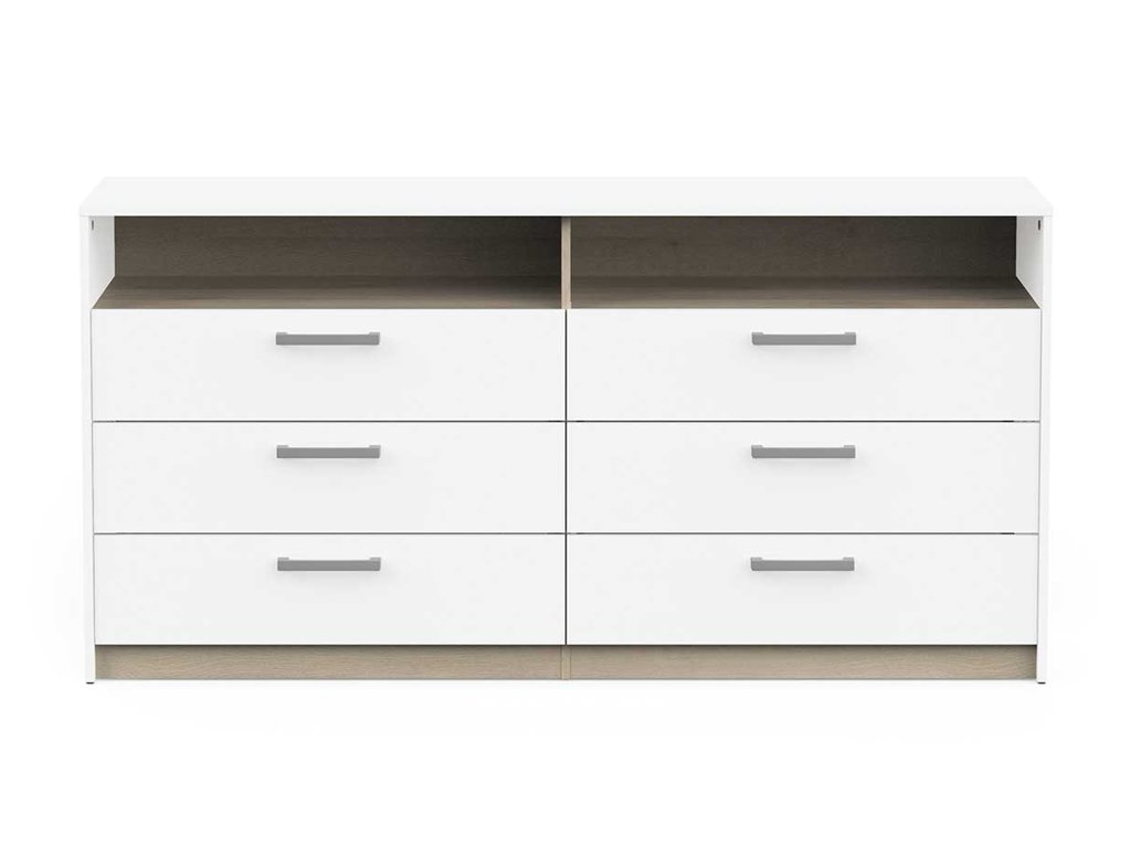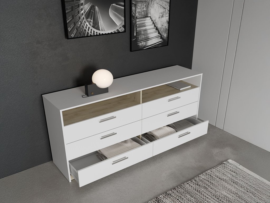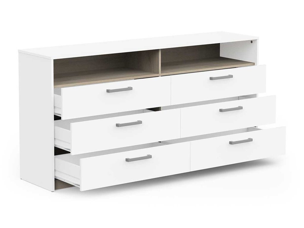 Ponúka šesť priestranných zásuviek na uloženie oblečenia, dokumentov alebo iných osobných vecí a otvorenú policu, ktorá je ideálna na vystavenie dekorácií, kníh či každodenných potrieb.