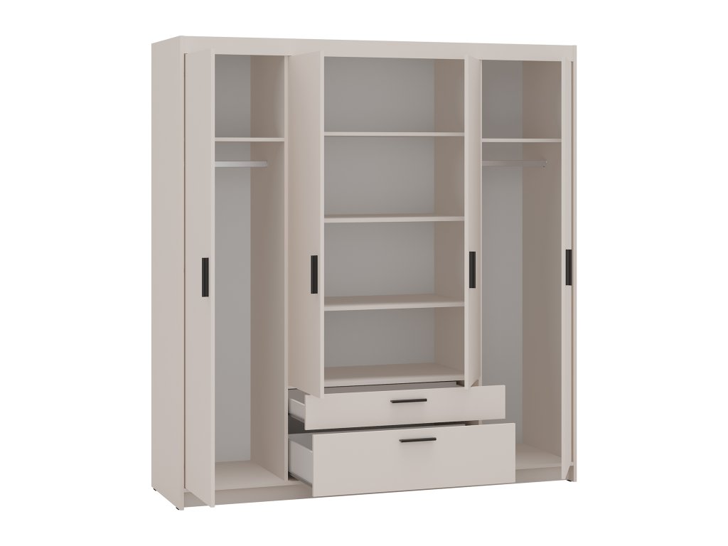 Vnútorné usporiadanie tohto modelu je premyslené do posledného detailu, aby vám uľahčilo každodennú organizáciu šatníka. Centrálnu časť vypĺňa systém políc na zložené oblečenie, ktorý dopĺňa dvojica zásuviek rôznych veľkostí, ideálna na bielizeň alebo drobné doplnky. Po stranách nájdete samostatné sekcie s kratšími vešiakovými tyčami a hornými policami, ktoré sú ako stvorené na šaty, saká či bundy. Celá konštrukcia z odolnej laminovanej dosky s ochrannými melamínovými hranami zaručuje, že skriňa hravo zvládne nároky bežnej domácnosti. Praktické čierne úchytky len podčiarkujú kvalitu spracovania, ktorá vnesie do vášho bývania systém a čistotu.