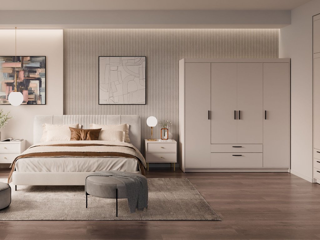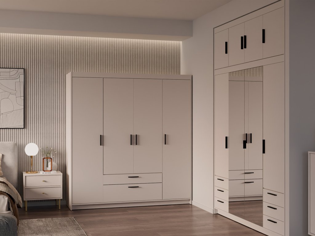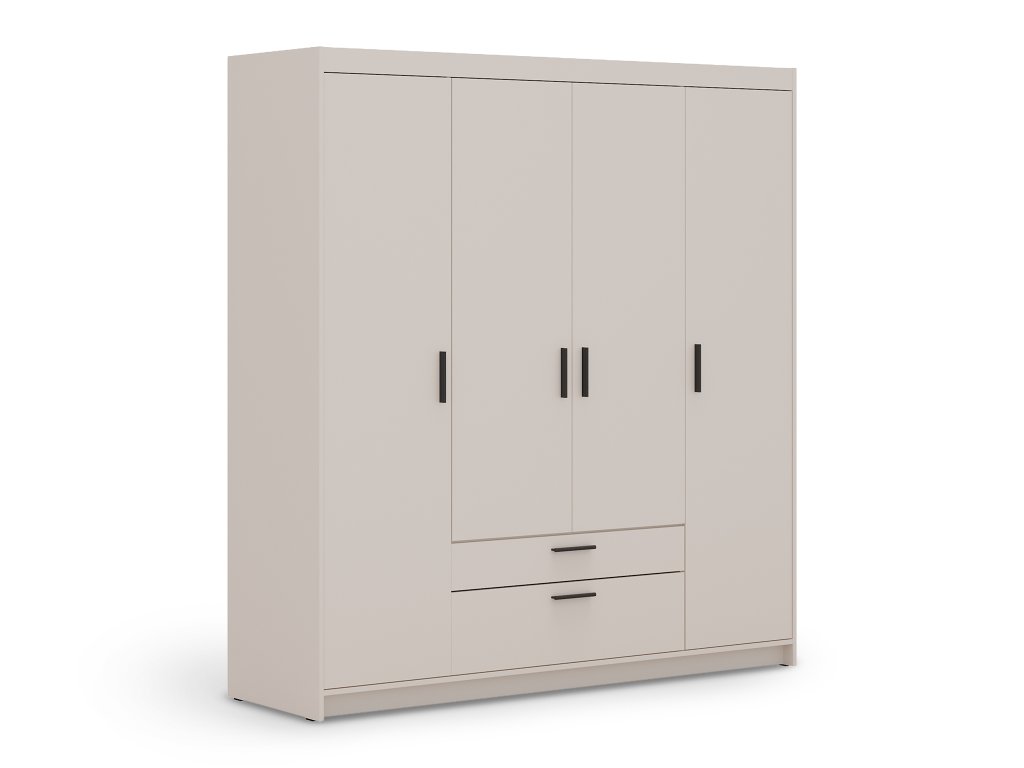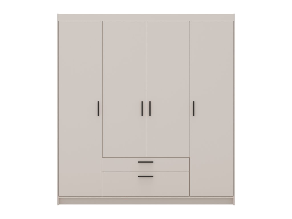 Štvordverová šatníková skriňa so zásuvkami Elenas v jemnom pieskovom odtieni predstavuje dokonalú rovnováhu medzi modernou estetikou a každodennou praktickosťou. Tento špecifický farebný tón vnáša do miestnosti vizuálny pokoj a ľahkosť, vďaka čomu skriňa prirodzene zapadne nielen do spálne, ale aj do študentskej izby či vstupnej haly. Jej nadčasové línie a hrejivý charakter pieskového dekoru pomáhajú vytvoriť útulné prostredie, ktoré nepodlieha meniacim sa trendom, a zároveň udržujú priestor opticky otvorený a uprataný.