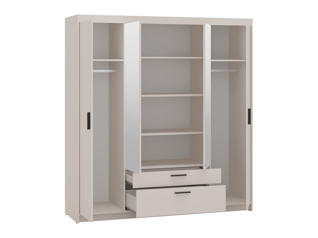 Tento štedrý úložný priestor je rozdelený tak, aby vyhovoval všetkým vašim potrebám – od dlhých kabátov až po drobné doplnky. Vnútorné členenie zahŕňa centrálnu policovú časť na prehľadné uloženie oblečenia a dve praktické zásuvky na bielizeň. Po stranách sa nachádzajú samostatné sekcie vybavené vešiakovými tyčami a hornými policami, ktoré sú perfektným riešením pre šaty, saká a bundy. Kvalitná konštrukcia z laminovanej drevotriesky s melamínovými hranami chráni skriňu pred poškriabaním a zaručuje jej dlhú životnosť. Čierne úchytky a zrkadlová plocha robia z tejto skrine Elenas špičkový produkt, ktorý spája špičkovú kvalitu s vysokou úžitkovou hodnotou.