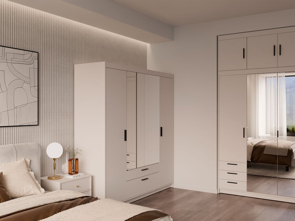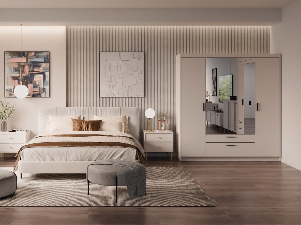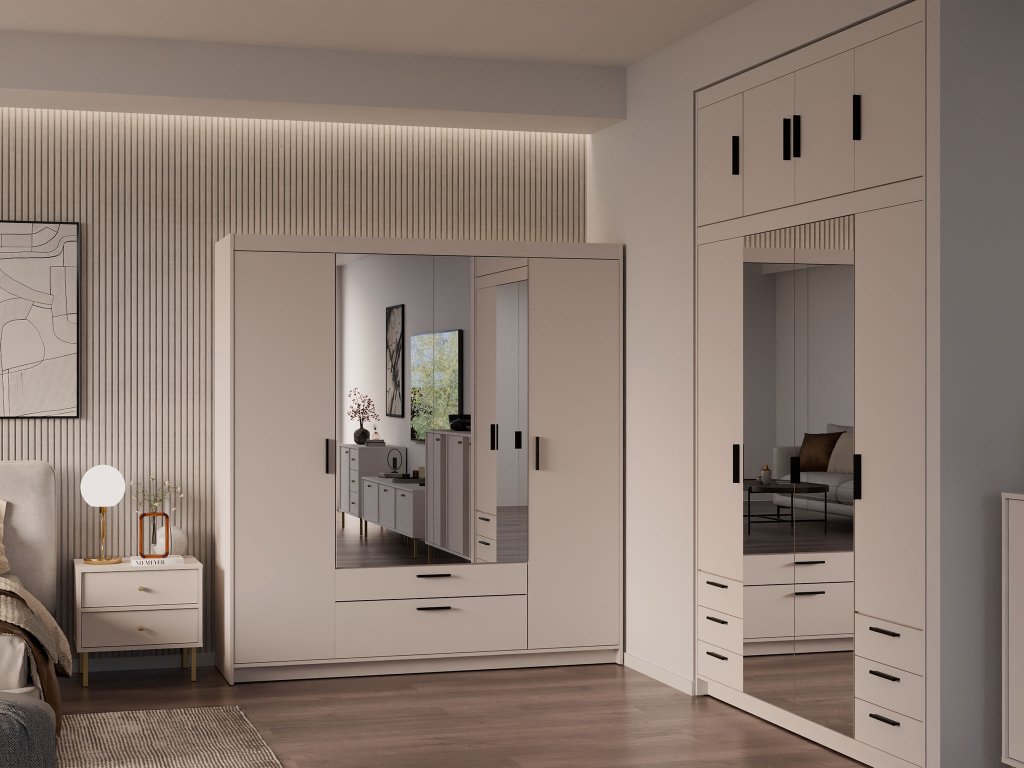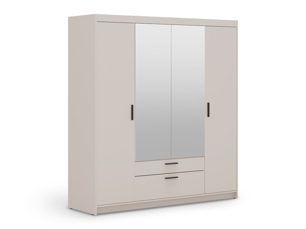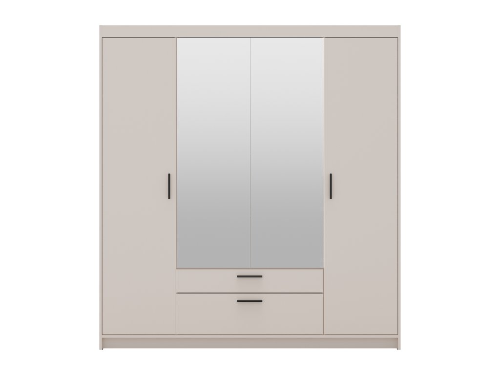 Ak hľadáte funkčný a zároveň estetický nábytok, štvordverová šatníková skriňa so zrkadlom Elenas v pieskovom prevedení je ideálnou voľbou pre váš interiér. Tento moderný odtieň pôsobí mimoriadne svetlo a elegantne, vďaka čomu opticky zväčší aj menšiu spálňu, študentskú izbu či predsieň. Dominantným prvkom sú stredové dvere so zrkadlom, ktoré nielen uľahčujú každodennú kontrolu outfitu, ale do miestnosti vnášajú žiadanú vzdušnosť a prirodzené svetlo. Nadčasový vzhľad skrine v pieskovom dekore je navrhnutý tak, aby harmonicky ladil s trendmi moderného bývania a zároveň poskytoval pocit maximálneho poriadku.