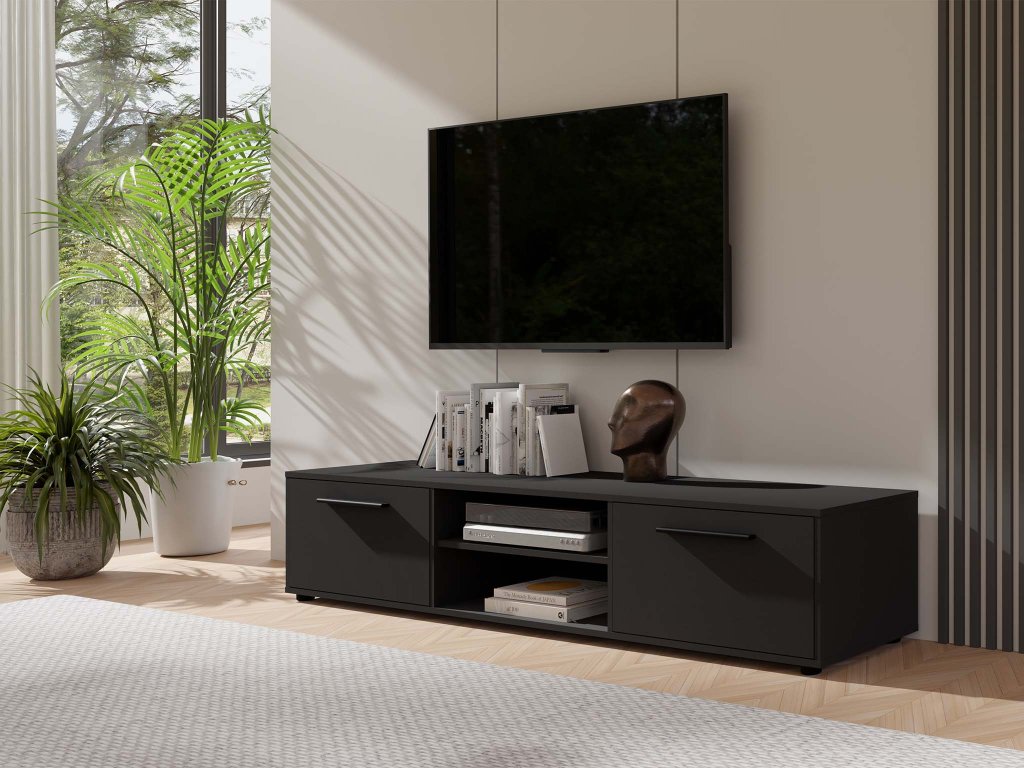 Prineste do svojho interiéru spojenie štýlu a funkčnosti s TV stolíkom Maxione v čiernom prevedení a šírkou 190 cm. Tento stolík nie je len stolík pod televízor – je dizajnovým prvkom, ktorý dodá vašej obývačke alebo spálni moderný charakter a pomôže udržať priestor prehľadný a uprataný. TV stolík je vybavený bočnými skrinkami s výklopnými dvierkami a otvorenou policou, ktoré poskytujú dostatok miesta na multimediálne zariadenia, herné konzoly, ovládače alebo dekorácie. Takto bude každý predmet na svojom mieste a vaša obývačka pôsobí organizovane a útulne.