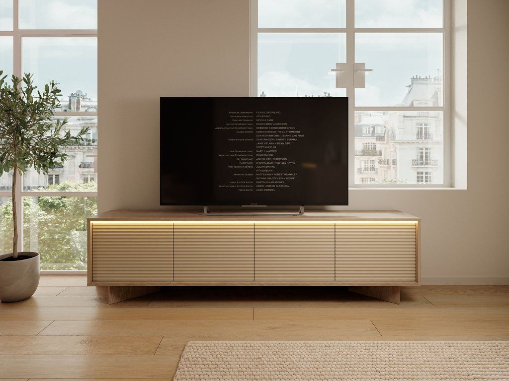 - Koberce a závesy: Odporúčame koberce s jemným geometrickým vzorom a ľahké závesy, ktoré opticky otvoria priestor a nechajú vyniknúť čisté línie TV stolíka.