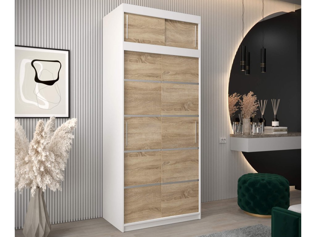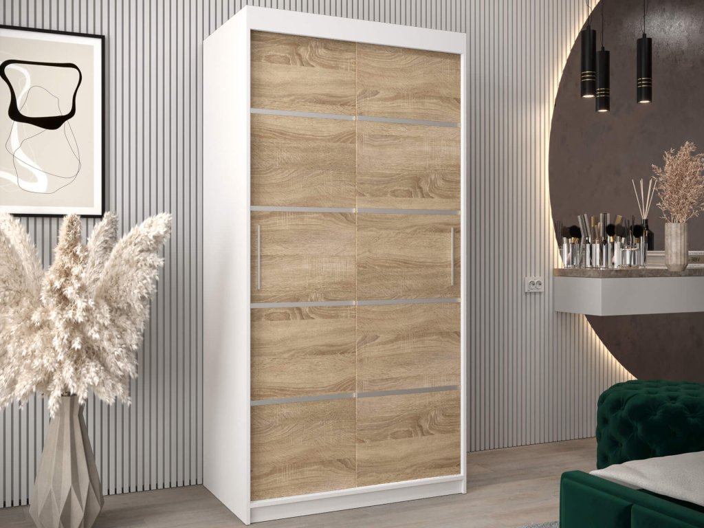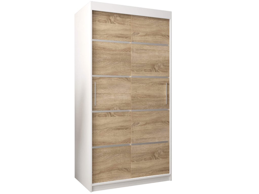 Skriňa Alyxia 100/120 v príjemnom farebnom prevedení (biela / dub sonoma) je vyrobená z vysoko kvalitnej laminovanej dosky (DTD) o hrúbke 16 mm, ktorá je odolná voči poškriabaniu, vlhkosti a vysokej teplote. Hrany skrine sú upravené kvalitnou PVC dyhou. Použitý je posúvný systém ,,BIMAK“ a hliníkové vodidlá, ktoré Vám zaručia pohodlné otváranie a zatváranie dverí. Vnútorné rozloženie skrine je rozčlenené na dve časti. Pravá strana je tvorená štyrmi policami, ktoré vytvoria päť praktických úložných priestorov a na ľavej strane sa nachádza jedna polička a dve vešiakové tyče. Moderná skriňa vhodná do spálne, chodby či predsiene.