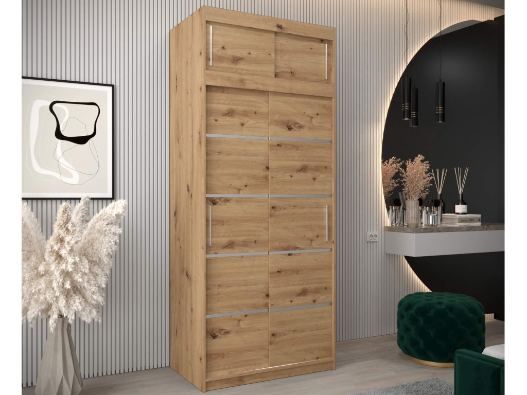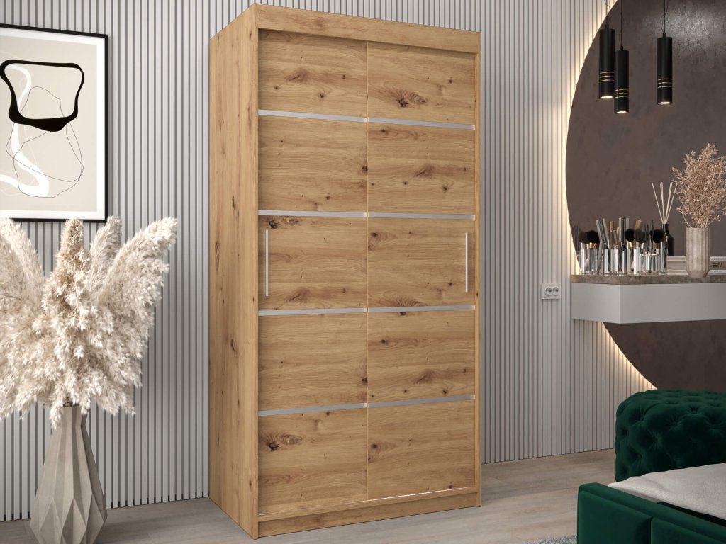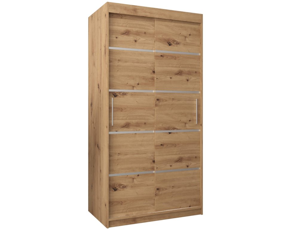 Moderná skriňa Alyxia 100/120 vo farbe dub artisan je vyrobená z vysoko kvalitnej laminovanej dosky (DTD) o hrúbke 16 mm, ktorá je odolná voči poškriabaniu, vlhkosti a vysokej teplote. Hrany skrine sú upravené kvalitnou PVC dyhou. Použitý je posúvný systém ,,BIMAK“ a hliníkové vodidlá, ktoré Vám zaručia pohodlné otváranie a zatváranie dverí. Vnútorné rozloženie skrine je rozčlenené na dve časti. Pravá strana je tvorená štyrmi policami, ktoré vytvoria päť praktických úložných priestorov a na ľavej strane sa nachádza jedna polička a dve vešiakové tyče. Moderná skriňa vhodná do spálne, chodby či predsiene.