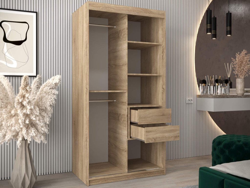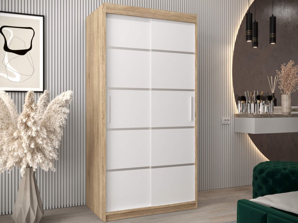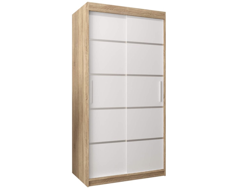 Moderná skriňa Alyxia 100/120 v kombinácii farieb dub sonoma a biela. Skriňa je vyrobená z vysoko kvalitnej laminovanej dosky (DTD) o hrúbke 16 mm, ktorá je odolná voči poškriabaniu, vlhkosti a vysokej teplote. Hrany skrine sú upravené kvalitnou PVC dyhou. Použitý je posúvný systém ,,BIMAK“ a hliníkové vodidlá, ktoré Vám zaručia pohodlné otváranie a zatváranie dverí. Vnútorné rozloženie skrine je rozčlenené na dve časti. Pravá strana je tvorená štyrmi policami, ktoré vytvoria päť praktických úložných priestorov a na ľavej strane sa nachádza jedna polička a dve vešiakové tyče. Moderná skriňa vhodná do spálne, chodby či predsiene.