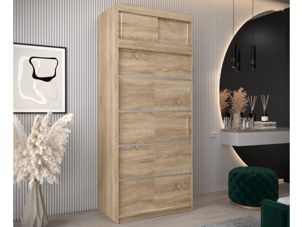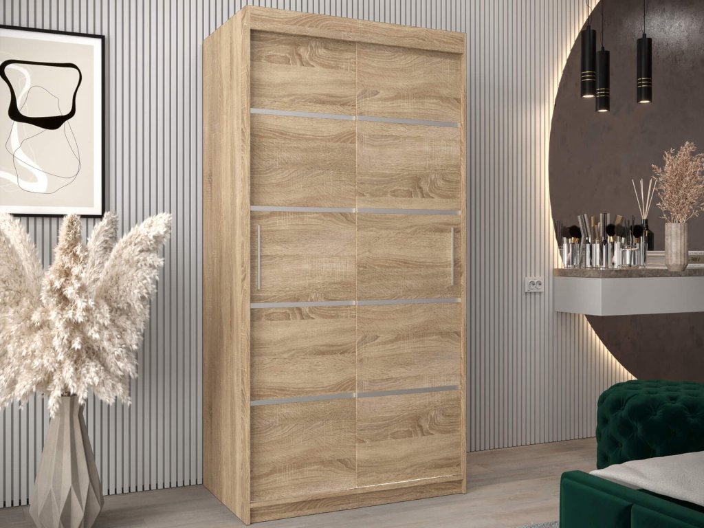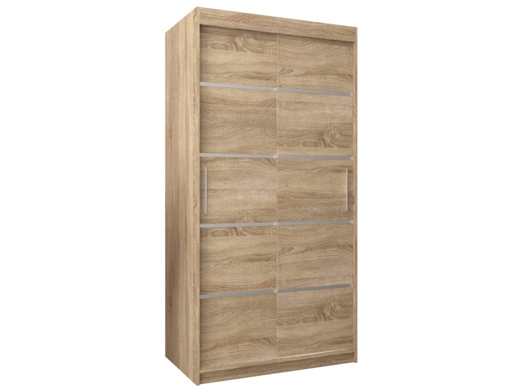 Skriňa Alyxia 100/120 v nadčasovej farbe dub sonoma je vyrobená z vysoko kvalitnej laminovanej dosky (DTD) o hrúbke 16 mm, ktorá je odolná voči poškriabaniu, vlhkosti a vysokej teplote. Hrany skrine sú upravené kvalitnou PVC dyhou. Použitý je posúvný systém ,,BIMAK“ a hliníkové vodidlá, ktoré Vám zaručia pohodlné otváranie a zatváranie dverí. Vnútorné rozloženie skrine je rozčlenené na dve časti. Pravá strana je tvorená štyrmi policami, ktoré vytvoria päť praktických úložných priestorov a na ľavej strane sa nachádza jedna polička a dve vešiakové tyče. Moderná skriňa vhodná do spálne, chodby či predsiene.