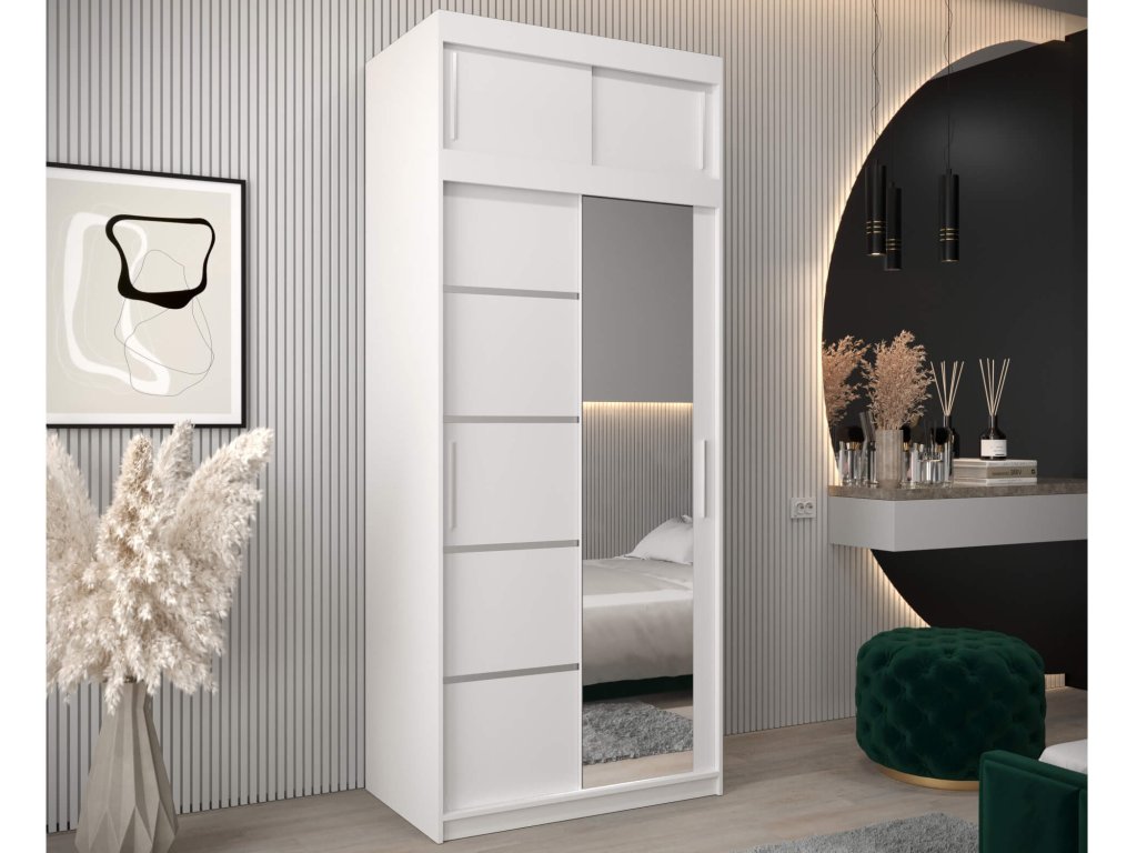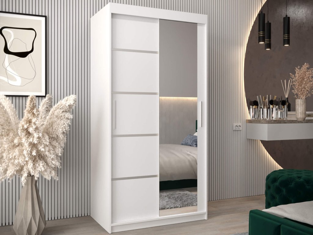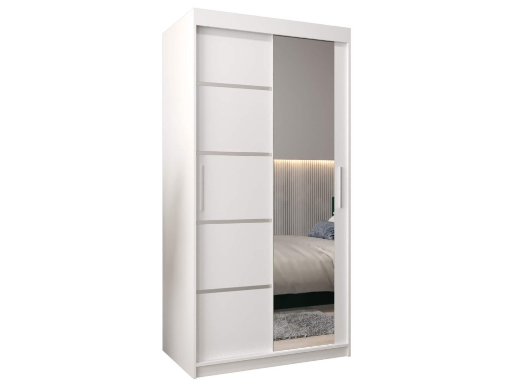 Biela skriňa Alyxia II 100/120 so zrkadlom je vyrobená z vysoko kvalitnej laminovanej dosky (DTD) o hrúbke 16 mm, ktorá je odolná voči poškriabaniu, vlhkosti a vysokej teplote. Hrany skrine sú upravené kvalitnou PVC dyhou. Použitý je posúvný systém ,,BIMAK“ a hliníkové vodidlá, ktoré Vám zaručia pohodlné otváranie a zatváranie dverí. Vnútorné rozloženie skrine je rozčlenené na dve časti. Pravá strana je tvorená štyrmi policami, ktoré vytvoria päť praktických úložných priestorov a na ľavej strane sa nachádza jedna polička a dve vešiakové tyče. Moderná skriňa vhodná do spálne, chodby či predsiene.